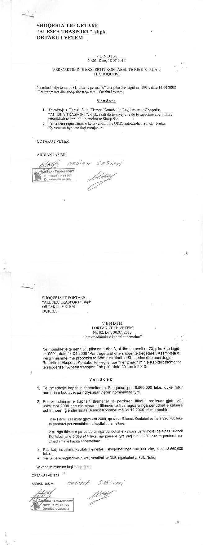 → Ekstrakti Historik i Regjistrit Tregtar date 07.11.2022 → Akt themelimi dhe Statuti i Shoqerise → Kontrate Shitblerje Kuotash date 06.07.2007 → Vendim i Ortakut te Vetem, Zmadhim Kapitali date 30.07.2010 → Kontrate Shitje Kuotash date 04.05.2013 → Kontrate Shitje Kuotash date 23.10.2013 → Vendim i Ortakut te Vetem, Zmadhim Kapitali date 27.03.2014 → Ekstrakt Historik i Regjistrit Tregtar date 08.04.2023 |