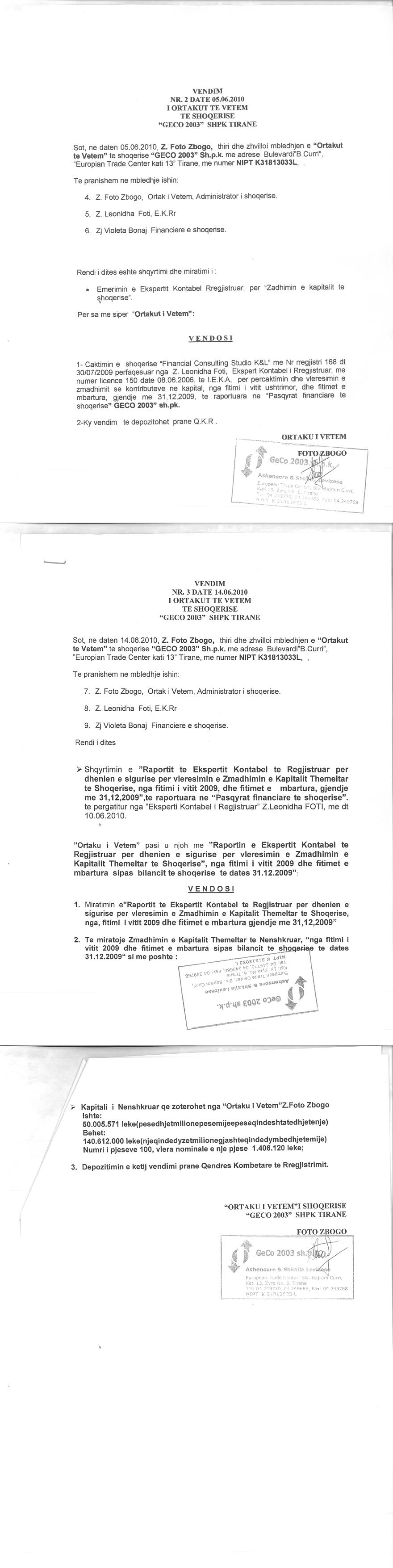→ Ekstrakt historik i regjistrit tregtar date 01.10.2021 → Akti i themelimit → Vendimi i ortakut te vetem per zmadhimin e kapitalit date 14.06.2010 → Vendimi i asamblese se ortakeve per zmadhimin e kapitalit date 19.04.2017 → Vendimi i ortakut te vetem per zvogelimin e kapitalit date 04.06.2021 → Ekstrakt Historik i Regjistrit Tregtar date 10.07.2025 → Vendim i Asamblesë së Ortakut të Vetëm për Zmadhimin e Kapitalit datë 21.09.2023 → Vendim Nr. 07, datë 09.07.2024 i Këshillit Kombëtar të Territorit për Miratimin e Lejes së Zhvillimit për Objektin: “Kompleks me Godina Banimi dhe Shërbimi 1-3 kate mbi tokë dhe 1 Kat parkim nëntokë me pishina dhe mur rrethues”, me Vendndodhje në Dhërmi, Bashkia Himarë. |