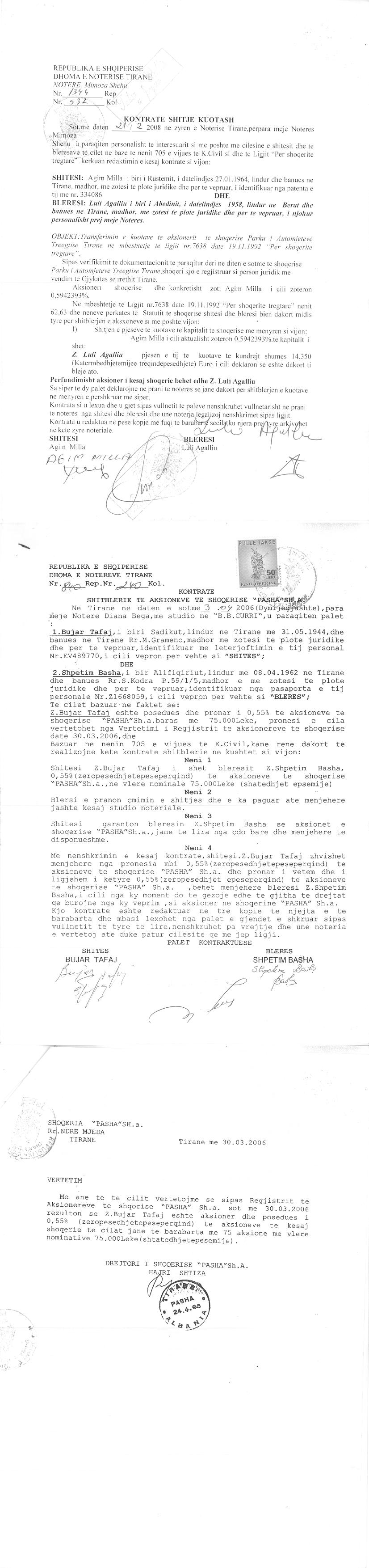 V.Sipas kontrates se shitjes se aksioneve date 03.04.2006, eshte realizuar shitja e 0.55% te aksioneve (me vlere 75.000 Leke) nga Bujar Tafaj kundrejt Shpetim Basha.