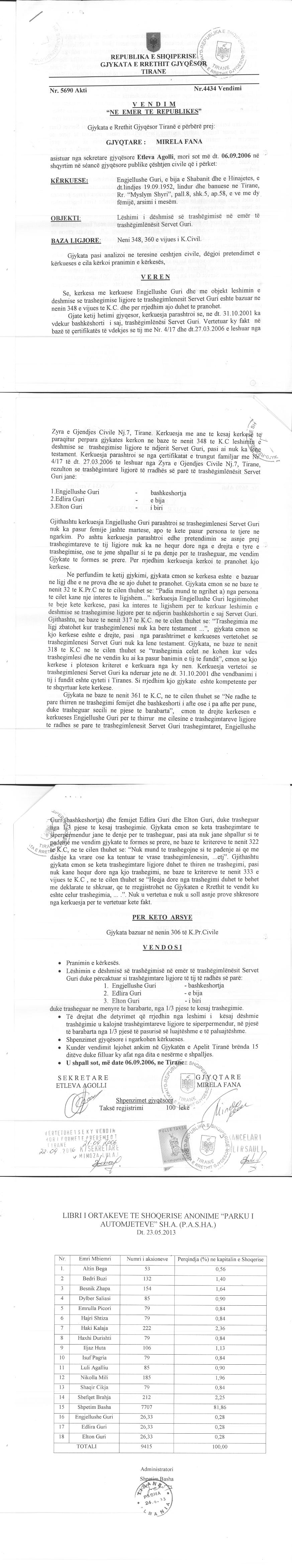 anonime Parku i Automjeteve. Shitjen e aksioneve te Mesar Derhemi, Valda Demiri, Sotir