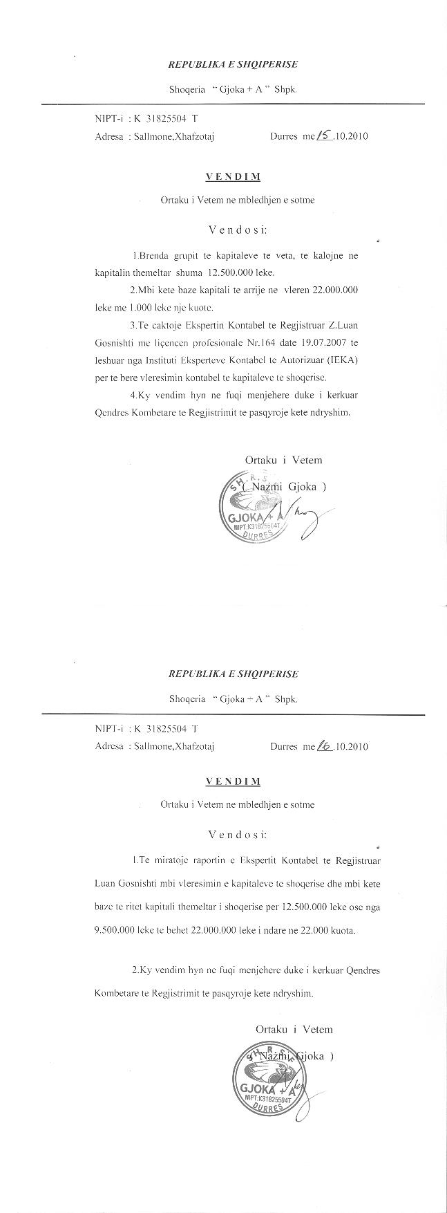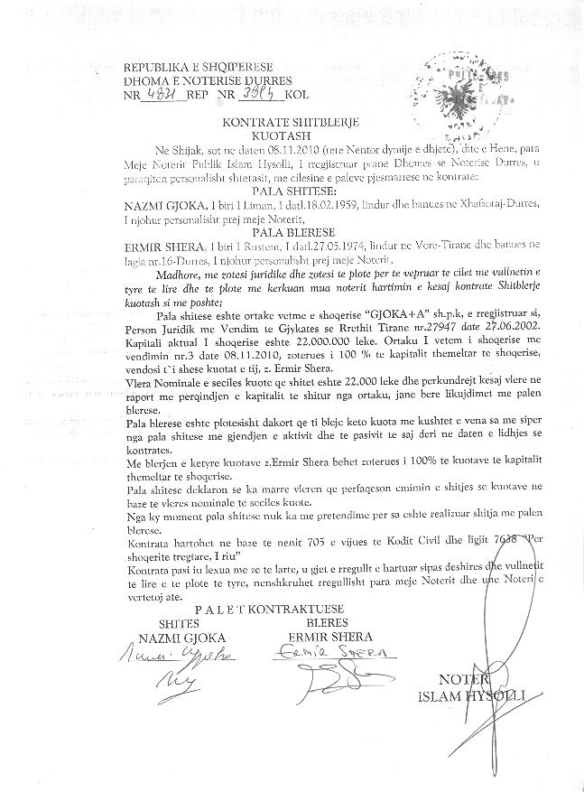 → Ekstrakt historik i regjistrit tregtar 26.05.2021 → Akti i themelimit dhe statuti → Kontrate shitblerje kuotash 06.07.2006 → Kontrate shitje 11.06.2013 → Kontrate shitblerje kuotash 08.11.2010 → Vendim i ortakut te vetem per rritjen e kapitalit 15.10.2010 → Vendim i ortakut te vetem per zmadhimin e kapitalit 08.10.2012 → Vendim i asamblese se pergjithshme per fillimin e procedures se rritjes se kapitalit 25.02.2016 |