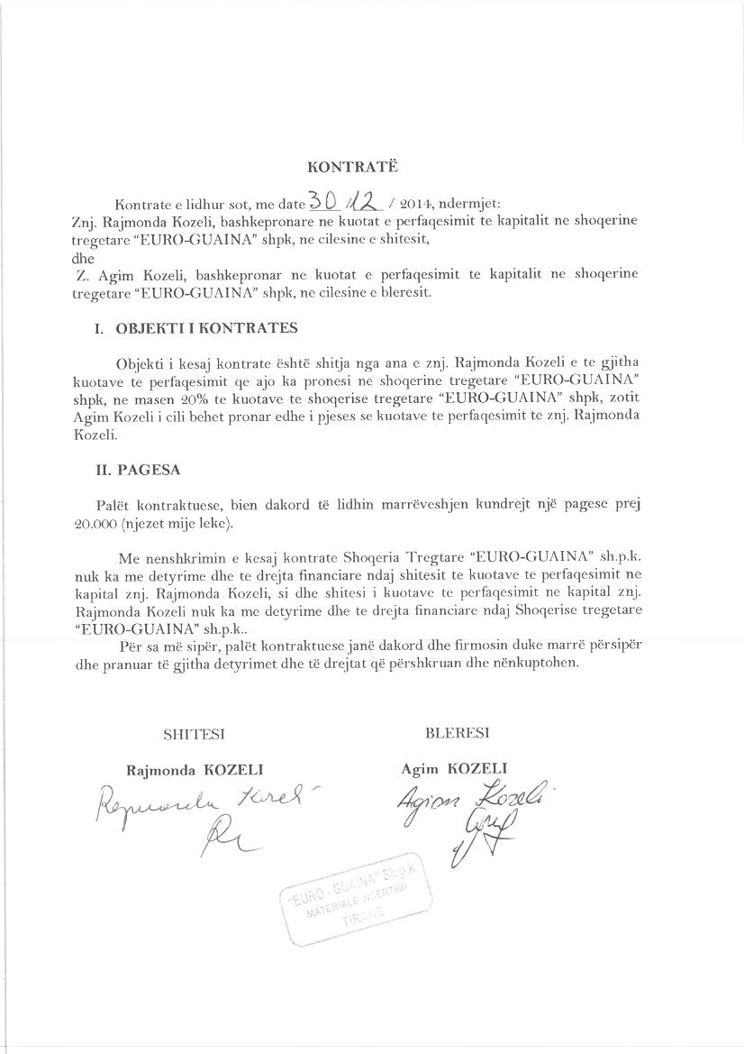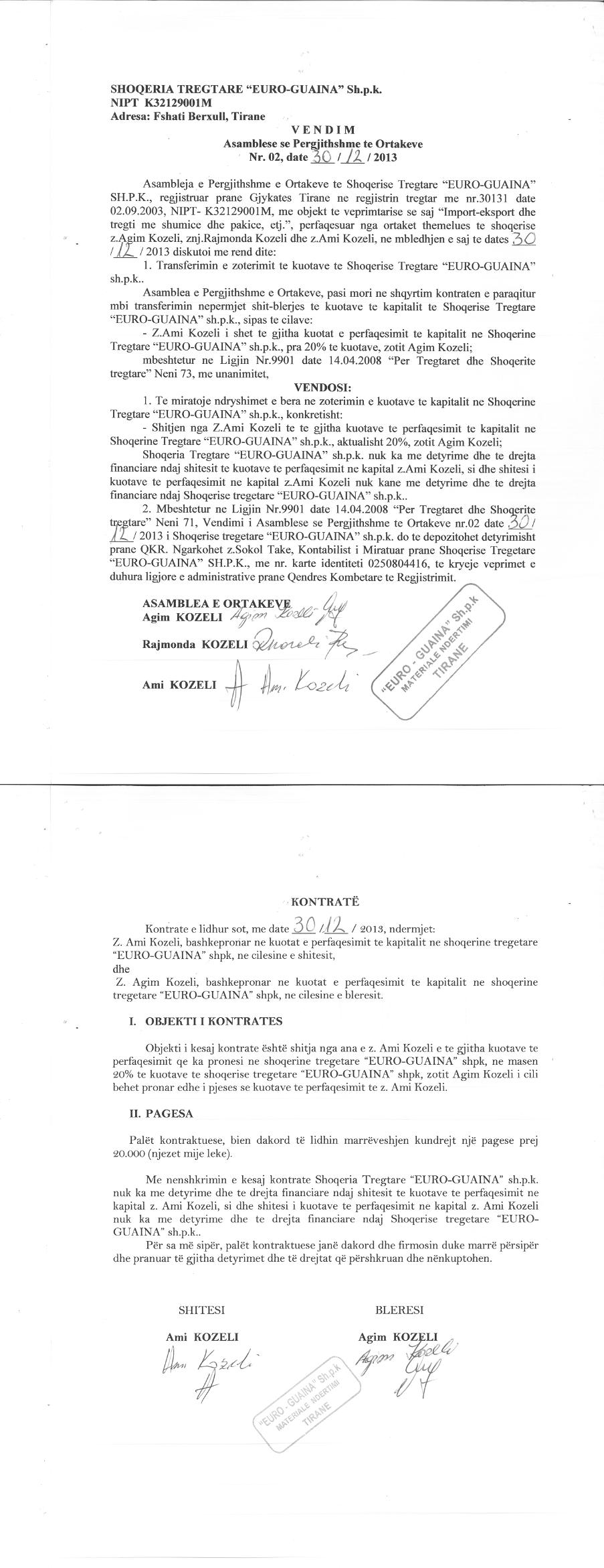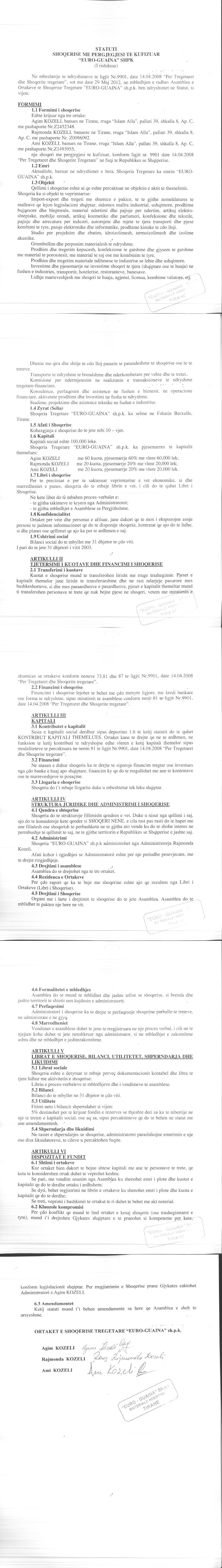 → Ekstrakti Historik i Regjistrit Tregtar date 02.08.2024 → Statuti fillestar i shoqerise dhe dokumenta te ndryshem → Statuti i perditesuar i shoqerise → Kontrate e shitjes se kuotave date 30.12.2013 → Kontrate e shitjes se kuotave date 30.12.2014 |