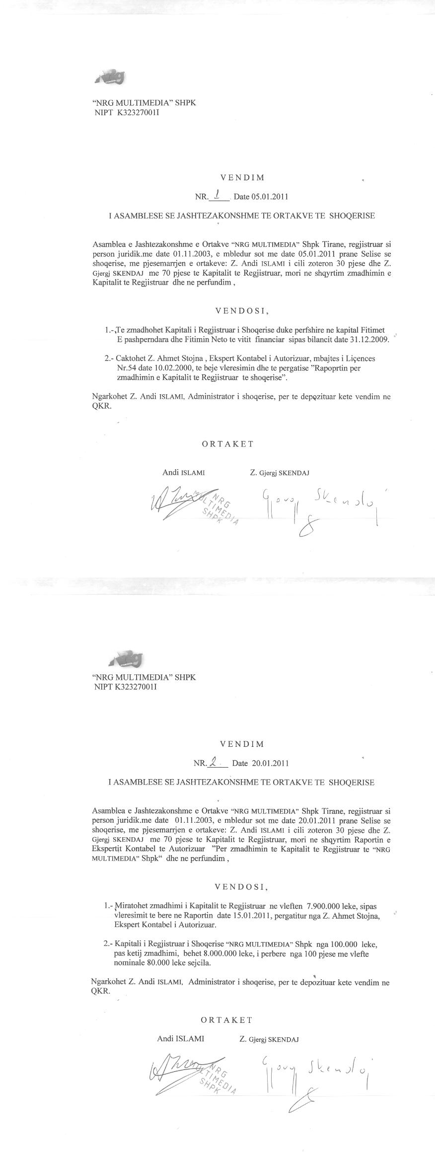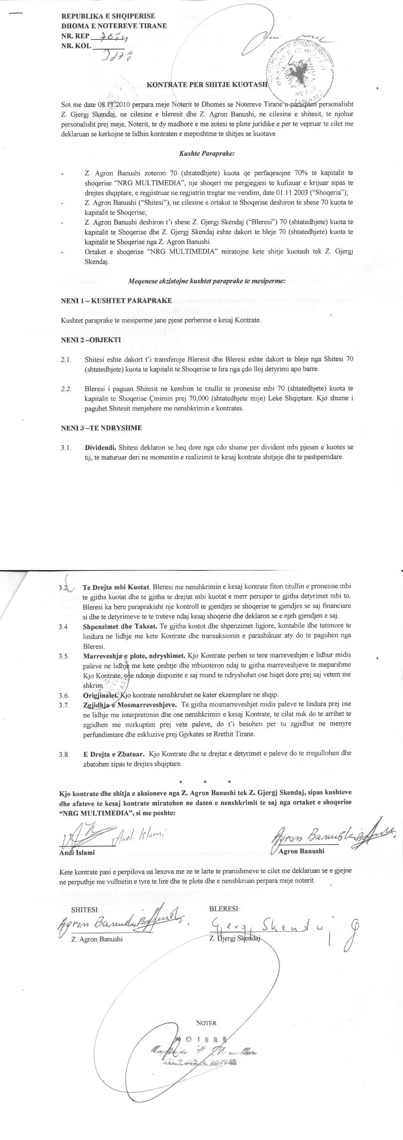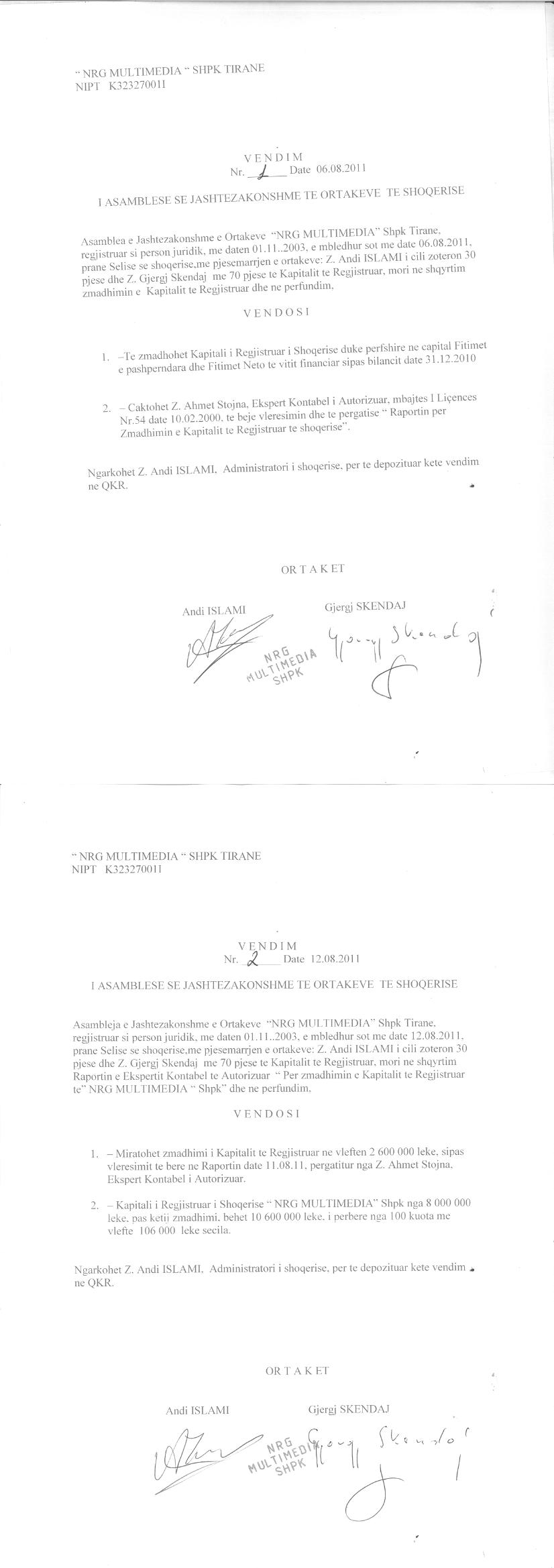 → Ekstrakt historik i regjistrit tregtar date 28.01.2023 → Akti i themelimit dhe statuti → Kontrate shitje date 01.10.2003 → Vendimi i asamblese se ortakeve per zmadhimin e kapitalit date 05.01.2011 → Vendimi i asamblese se ortakeve per zmadhimin e kapitalit date 06.08.2011 → Kontrate shitblerje kuotash date 25.05.2016 → Vendim i asamblese se ortakeve per zmadhim kapitali date 30.06.2016 → Vendim i ortakut te vetem per zmadhimin e kapitalit date 30.06.2017 → Vendimi i ortakut te vetem per rritjen e kapitalit date 10.07.2019 → Vendimi i ortakut te vetem per zvogelimin e kapitalit date 15.07.2019 → Kontrate per shitje kuotash date 08.11.2010 |
