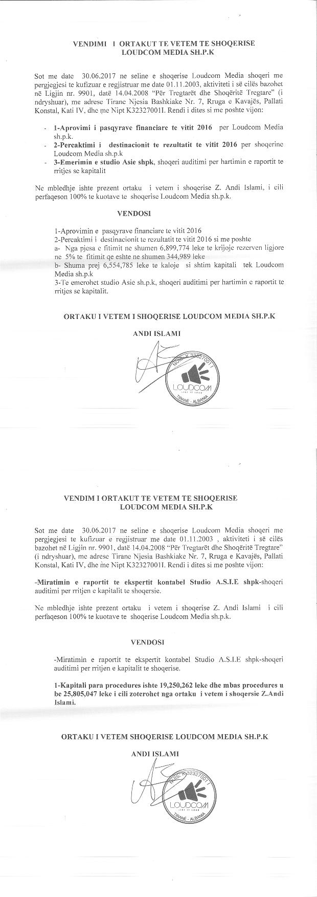 | Objekti i Veprimtarisë: | Krijimin e nje stacioni radio difuzioni per transferimin e programeve muzikore, sportive, reklamave etj. Produksion Audio-Vizual. Produksione eventesh te ndryshme. Menaxhim artistesh.Administrimi dhe menaxhimi i artisteve, te fonogramit si dhe me gjere, mbajtja e te drejtave pasurore te autorit kundrejt nje shperblimi. Lidhjen e kontratave nepermjet autorit ose titullarit per kalimin e nje ose me shume te te drejtave kundrejt nje shperblimi. Mbajtjen e te drejtes se riprodhimit te veprave artistike, te drejten e shperndarjes se veprave artistike, te drejten e komunikimit ne publik te veprave artistike, si dhe cdo te drejte tjeter te veprave artistike. Produksion te veprave audiovizuale te cdo lloji, organizim veprimtarie artistike te cdo lloji si dhe organizimin e fushtave promocionale apo fushatave mediatike per pale te treta. Shoqeria kryen 9do lloj aktiviteti qe ben pjese ne objektin e saj, qe lidhet me te dhe qe e favorizon ate. Ne perputhje me legjislacionin shqiptar, ne menyre qe te arrihet qellimi i siperpermendur, Shoqeria ka te drejte: te kryeje cdo transaksion ne lidhje me pasurite e luajtshme dhe te palujtshme, si dhe cdo aktivitet tregetar, financiar dhe industrial, dhenie-marrje me qira, te vedose pengje dhe barre hipotekore qe mund te konsiderohen si te dobishme apo te nevojshme per te arritur qellimet e Shoqerise; te kryeje cdo aktivitet ne lidhje me publikimin, marketingun apo reklamimin; te zoteroje kuota/aksione apo cdo lloj interesi tjeter ne shoqeri te tjera, pavaresisht fushes ne te cilen kryejne veprimtari keto shoqeri. Shoqeria kryen cdo lloj aktiviteti qe ben pjese ne objektin e saj, qe lidhet me te dhe qe e favorizon ate. Shoqeria zbaton te gjitha ligjet dhe aktet nenligjore perkatese. Ajo zbaton standartet me te larta te etikes. |