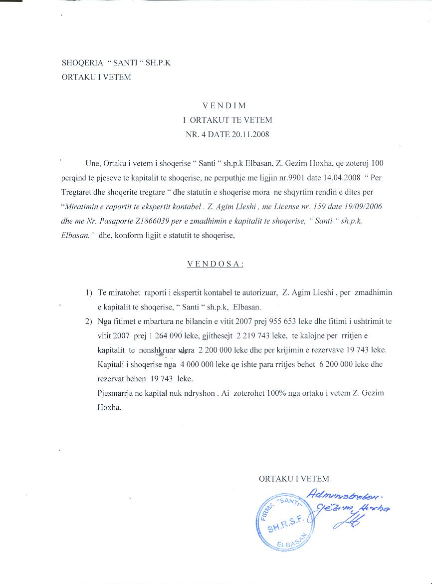 → Ekstrakt historik i regjistrit tregtar 26.11.2021 → Akti i themelimit → Vendim i ortakut te vetem per zmadhimin e kapitalit 20.11.2008 |