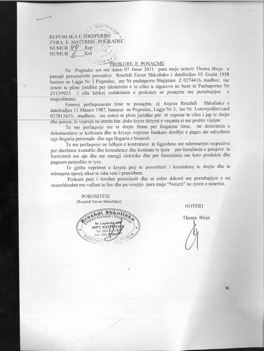 → Ekstrakt Historik i Regjistrit Tregtar date 01.03.2023 → Prokure e Posacme Perfaqesimi date 07.01.2011 |