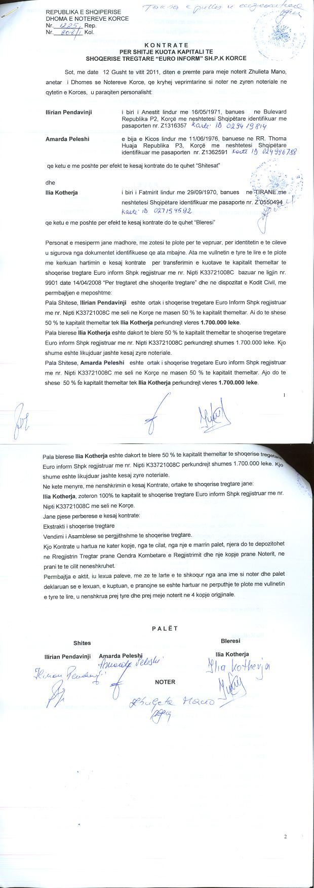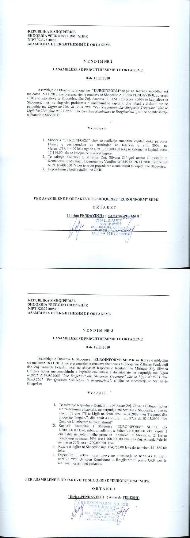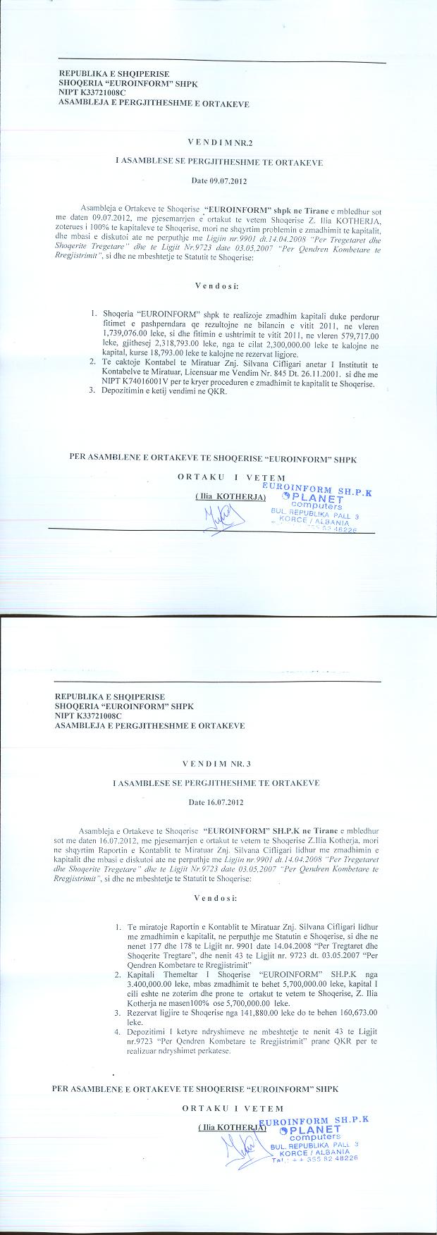 → Ekstrakt historik i regjistrit tregtar date 04.08.2021 → Akti i themelimit → Kontrate shitje kapitali fillestar date 25.01.2005 → Kontrate per shitje kuotash kapitali date 12.08.2011 → Vendimi i asamblese se ortakeve per zmadhimin e kapitalit date 09.07.2012 → Vendimi i asamblese se ortakeve per zmadhimin e kapitalit 15.11.2010 → Ekstrakt Historik i Regjistrit Tregtar date 19.01.2024 → Vendim i Asamblesë së Ortakëve, Zmadhim Kapitali datë 13.10.2022 → Ekstrakt Historik i Regjistrit Tregtar date 10.10.2025 |