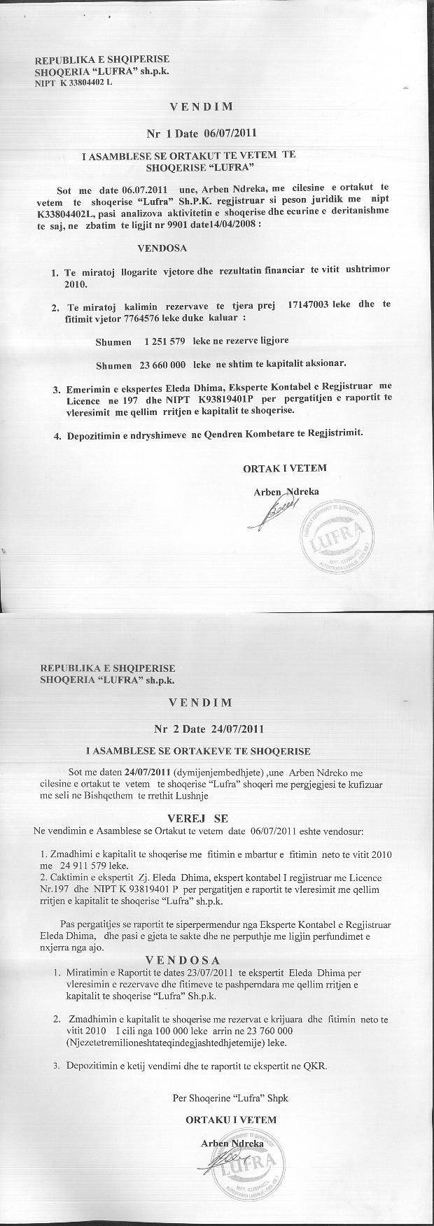 | Çështje Ligjore: | Marreveshje bashkimi me perthithje. Me date 06.09.2019, u hartua projekt-marreveshja mbi bashkimin me perthithje te shoqerise përthithëse "LUFRA " shpk dhe shoqërisë së përthithur "Crown Secyrity Services " shpk. Shoqeria perthithese “Lufra” shpk duke bere bashkimin e aktiveve e pasiveve te te dy shoqerive merr persiper te gjitha detyrimet ndaj te treteve qe kane mbetur per t’u shlyer deri me 31.12.2018 e ne vazhdim nga ana e shoqerise “Crown Security Services” shpk. Per zmadhimin e kapitalit te shoqerise se bashkuar ne perfundim te procesit te bashkimit nuk do te kete raport te vecante por do te raportohet se bashku me bashkimin. Shoqeria “Lufra” shpk do te jete zoteruese e kontributit te shoqerise “Crown Security Services” shpk ne daten e realizimit perfundimtar te operacionit. Sipas vleresimeve te bere, eshte rene dakort qe raporti i kembimit te pjeseve te kapitalit te jete: nje pjese e kapitalit te shoqerise perthithese te jete i barabarte me 1 kuote te kapitalit te shoqerise se perthithur “Crown Security Services” shpk dhe nje pjese e kapitalit themeltar te shoqerise perthithese te jete e barabarte me 1 kuote te kapitalit te shoqerise “Lufra” shpk. Ortaket e shoqerise “Crown Security Services” shpk do te behen ortake te shoqerise perthithese “Lufra” shpk. Si rezultat, ortake te shoqerise do te jene: Luis Ndreka (7.2%), Franc Ndreka (7.2%) dhe Arben Ndreka (85%). Ne perfundim te bashkimit, kapitali te nenshkruar te shoqerise “Lufra” shpk prej 23.760.000 (njezet e tre milion e shtateqind e gjashtedhjete mije) leke i shtohet edhe kapitali themeltar i shoqerise se perthithur prej 4.000.000 (kater milion) leke. Shuma e kapitalit te shoqerise “Lufra” shpk behet 27.760.000 (njezet e shtate milion e shtateqind e gjashtedhjete mije) leke. |