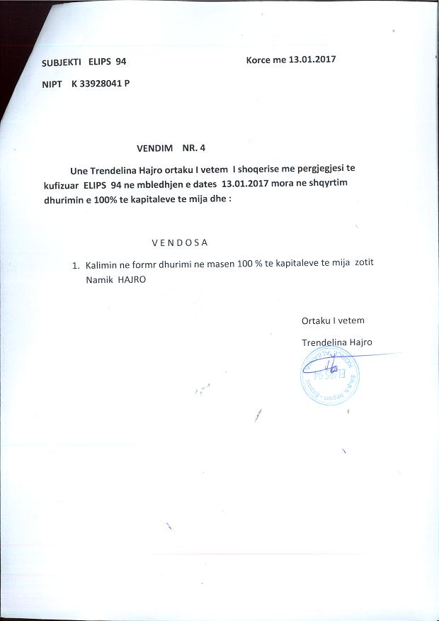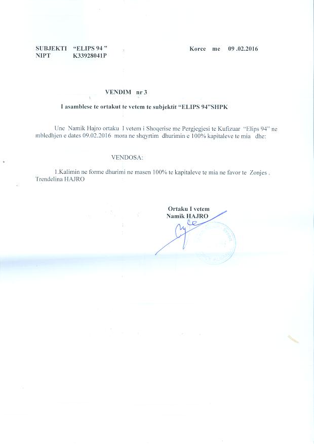 → Ekstrakti Historik i Regjistrit Tregtar date 04.11.2021 → Statuti i Shoqerise → Vendim per kalimin e kuoatve ne datat 28.07.1995 dhe 24.10.2002 → Vendim i ortakut te vetëm date 09.02.2016 → Vendim i ortakut te vetëm date 13.01.2017 |