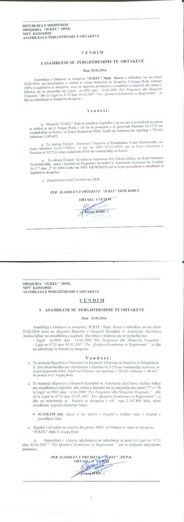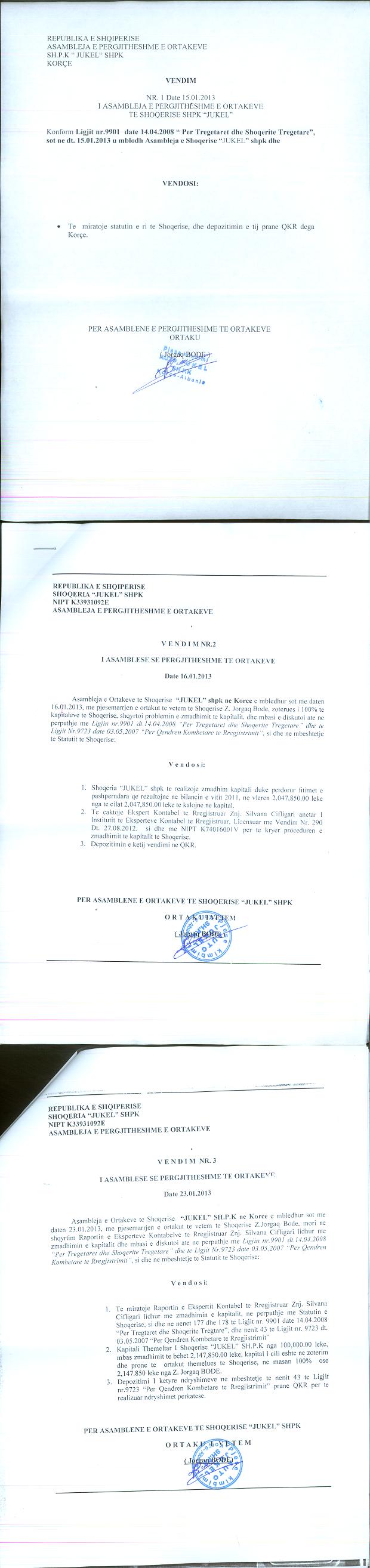 → Ekstrakti Historik i Regjistrit Tregtar date 10.12.2021 → Statuti i Shoqerise → Vendim i Asamblese se Pergjithshme per rritjen e kapitalit date 23.01.2013 → Vendim i Asamblese se Pergjithshme per rritjen e kapitalit date 25.02.2016 |