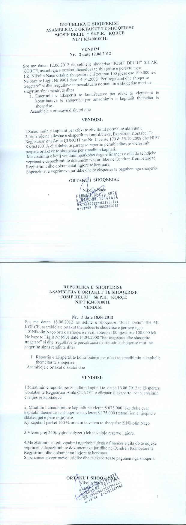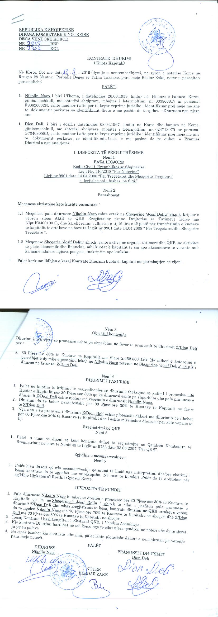 → Ekstrakti Historik i Regjistrit Tregtar date 11.11.2021 → Statuti i Shoqerise → Vendim i Asamblese se Pergjithshme per rritjen e kapitalit date 12.06.2012 → Kontrate e Dhurimit te Kuotave date 16.09.2019 |