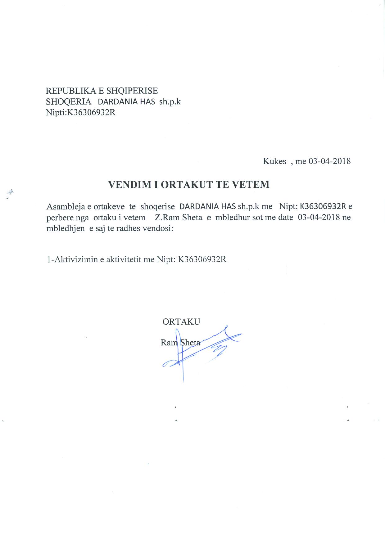 → Ekstrakt historik i regjistrit tregtar 15.07.2021 → Akti i themelimit dhe statuti → Kontrate shitblerje kuotash kapitali 01.02.2006 → Vendimi i ortakut te vetem per pezullimin e aktivitetit 22.01.2018 → Vendimi i ortakut te vetem per aktivizimin e shoqerise 03.04.2018 |