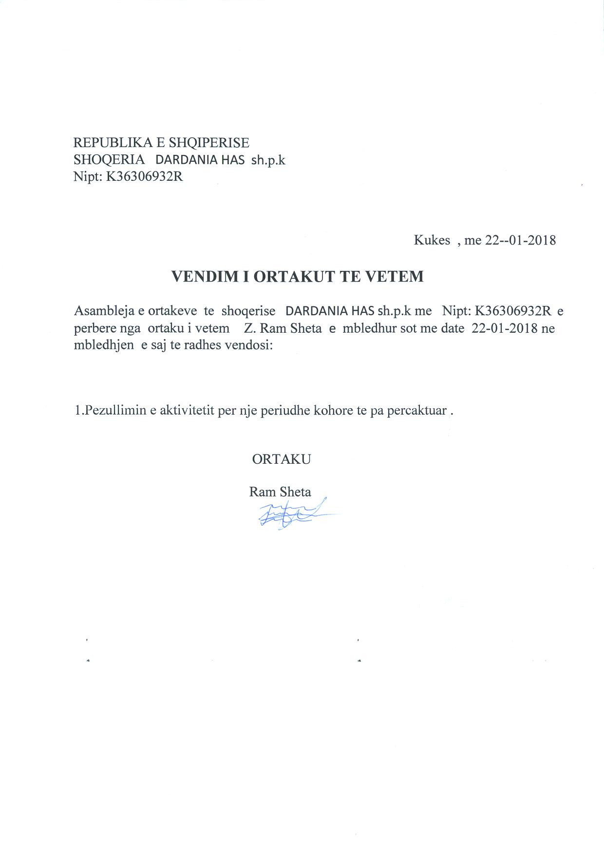 | Çështje Ligjore: | I. Më datë 22.01.2018, me vendim të asamblesë së ortakëve, u pezullua aktiviteti i shoqërisë për një periudhë kohore të papërcaktuar. Statusi i shoqërisë ndryshoi nga “Aktiv” në “Pezulluar”. II. Më datë 03.04.2018, me vendim të asamblesë së ortakëve, u aktivizua veprimtaria e shoqërisë. Statusi i shoqërisë ndryshoi nga “Pezulluar” në “Aktiv”. |
