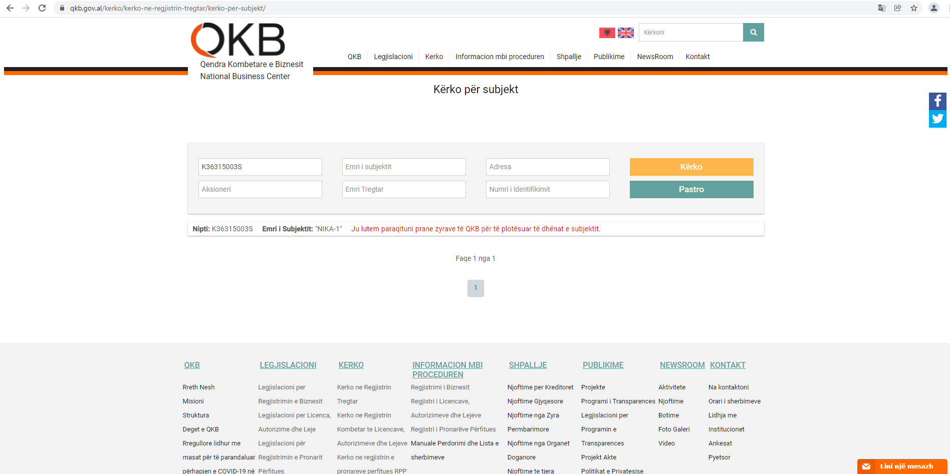 → Te dhenat ne QKB per shoqerine NIKA-1, date 28.01.2022 |