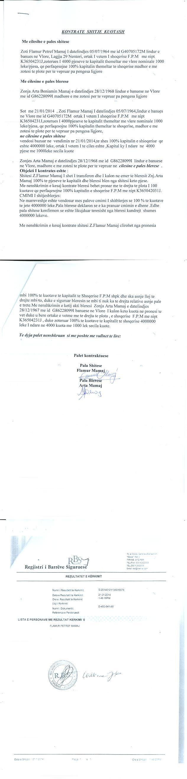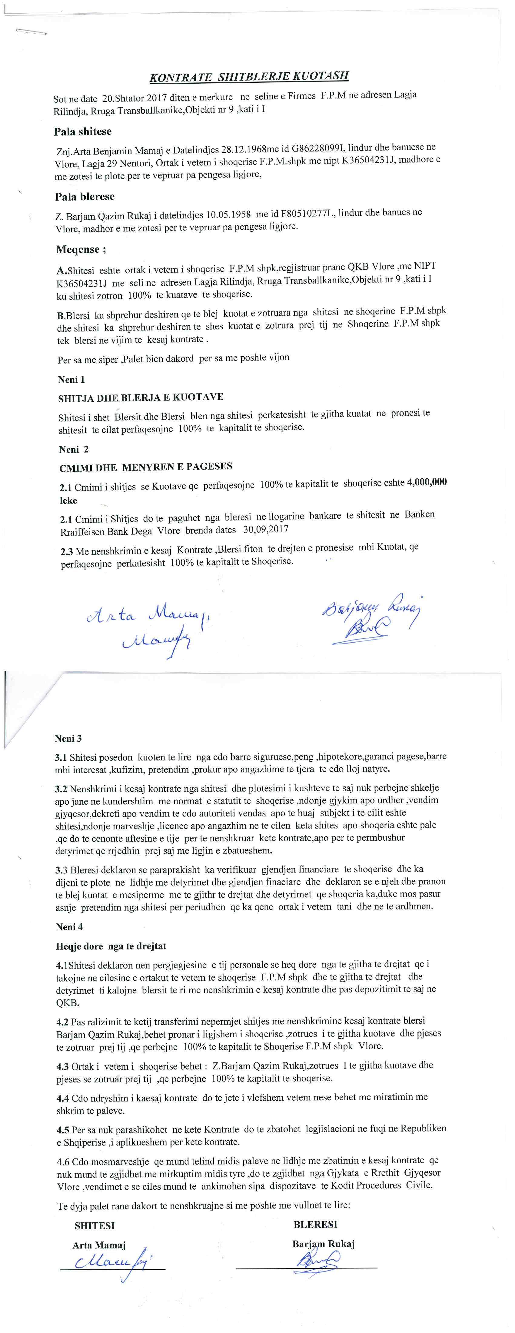 → Ekstrakt historik i regjistrit tregtar 18.03.2021 → Akti i themelimit → Kontrate shitblerje kuotash 20.09.2017 → Kontrate shitje kuotash 20.01.2014 |