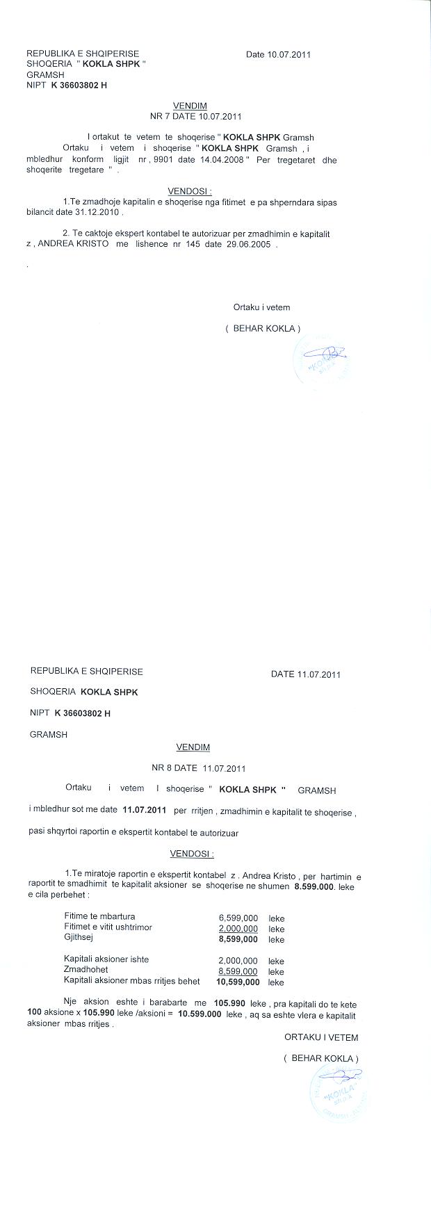 → Ekstrakt Historik i Regjistrit Tregtar date 24.08.2023 → Akt themelimi dhe Statuti i Shoqerise → Vendim i Ortakut të Vetëm, Zmadhim Kapitali datë 10.07.2011 |