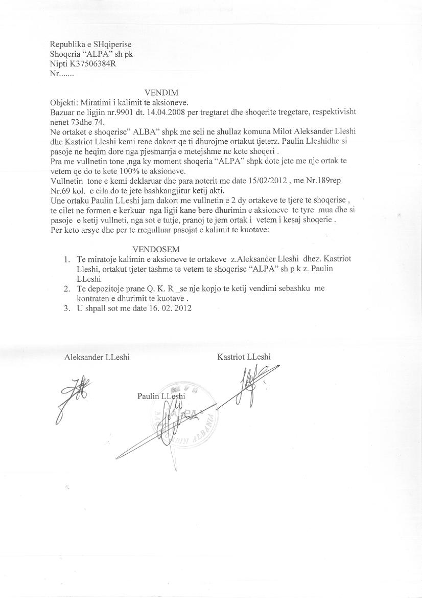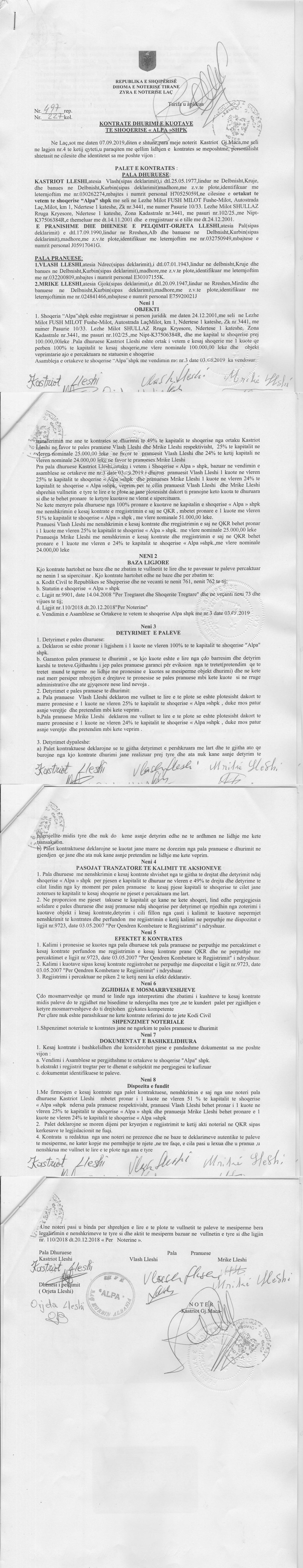 | Çështje Ligjore: | Me date 17/02/2015, me ane te Prokure e Pergjithshme Nr.77 Rep., Nr.28 Kol., date 27.1.2015, me ane te se ciles Admiistratori i Shoqerise "ALPA" shpk z. Kastriot Lleshi, emeron si perfaqesues te posaçem z. Aleksander Lleshi dhe z. Palulin Lleshi, te cilen te dy sebashku apo secili veç e veç, kane tager te perfaqesojne shoqerine sipas kesaj prokure. |