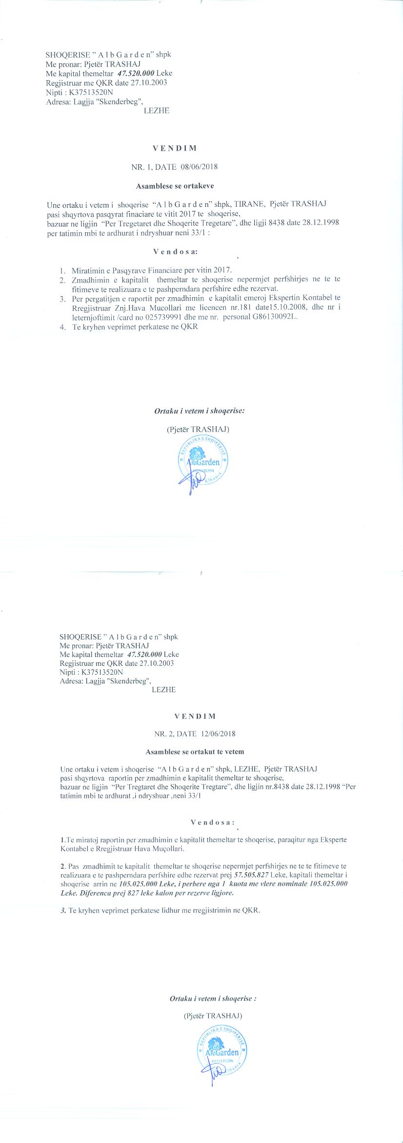 → Ekstrakt historik i regjistrit tregtar 10.06.2022 → Akti i themelimit → Vendim i ortakut te vetem per zmadhimin e kapitalit 12.06.2019 → Vendim i ortakut te vetem per zmadhimin e kapitalit 08.06.2018 → Vendimi i ortakut te vetem per zmadhimin e kapitalit 30.06.2020 → Ekstrakt Historik i Regjistrit Tregtar date 04.10.2023 → Vendim i Asamblesë së Ortakut, Zmadhim Kapitali datë 28.06.2022 → Vendim i Asamblesë së Ortakut, Zmadhim Kapitali datë 27.06.2023 → Ekstrakt Historik i Regjistrit Tregtar date 16.04.2024 → Të dhënat e Investimit, Financimet Nga IPARD - Aksesuar nga Agjencia për Zhvillim Bujqësor dhe Rural AZHBR datë 17.04.2024 |