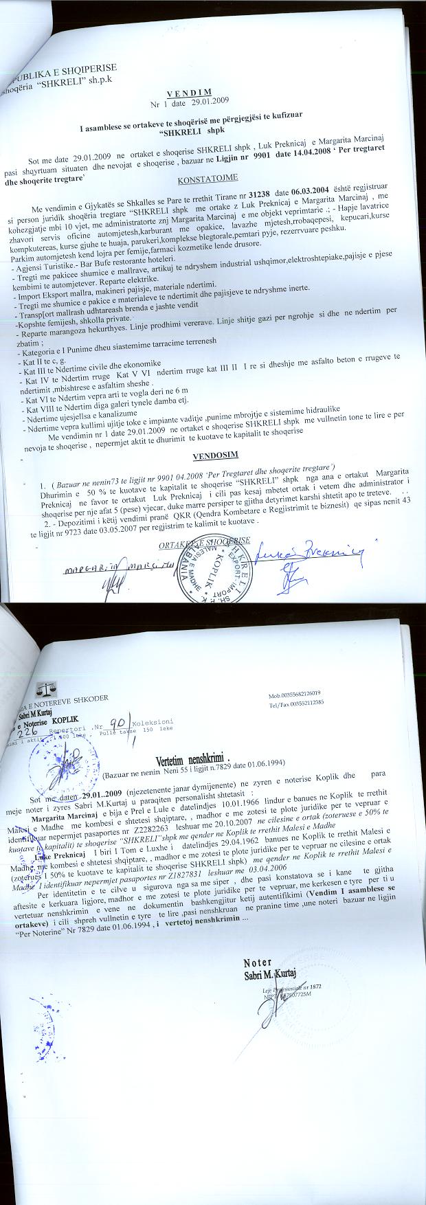 → Ekstrakt historik i regjistrit tregtar date 13.12.2021 → Akti i themelimit dhe statuti → Vendimi i asamblese se ortakeve per dhurimin e kuotave date 29.01.2009 |