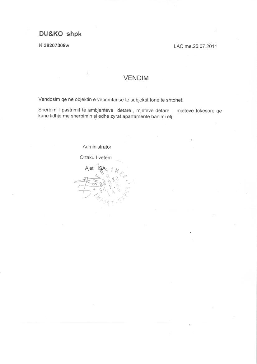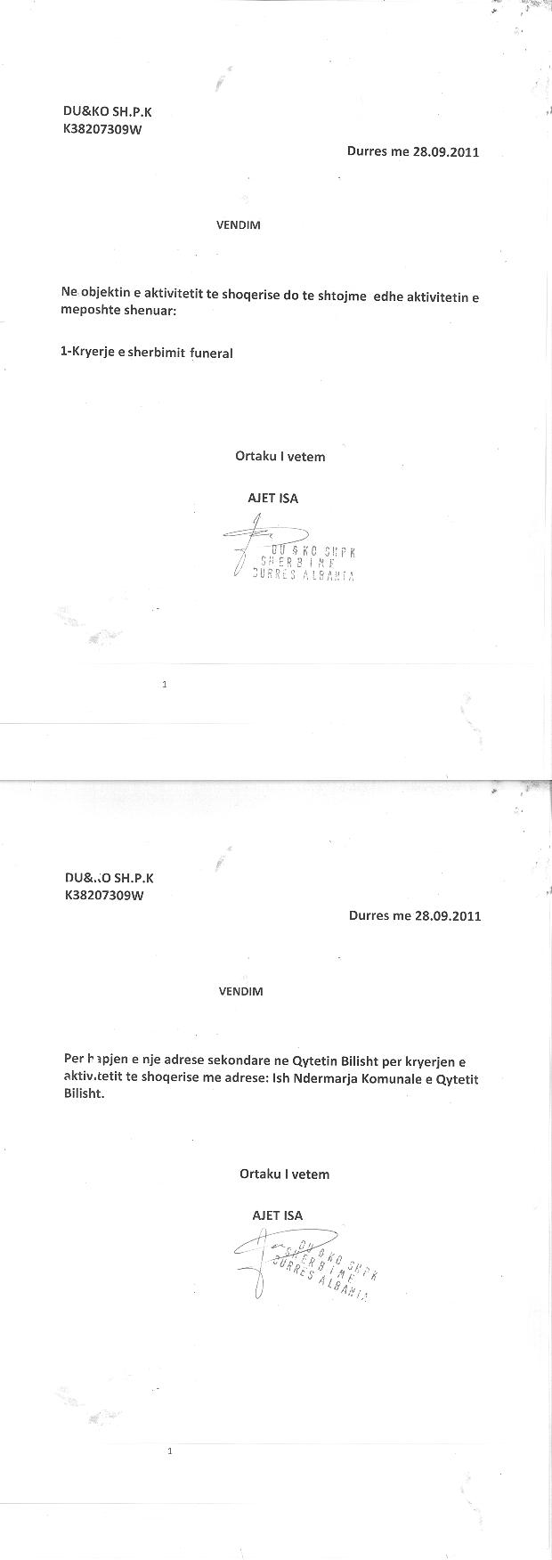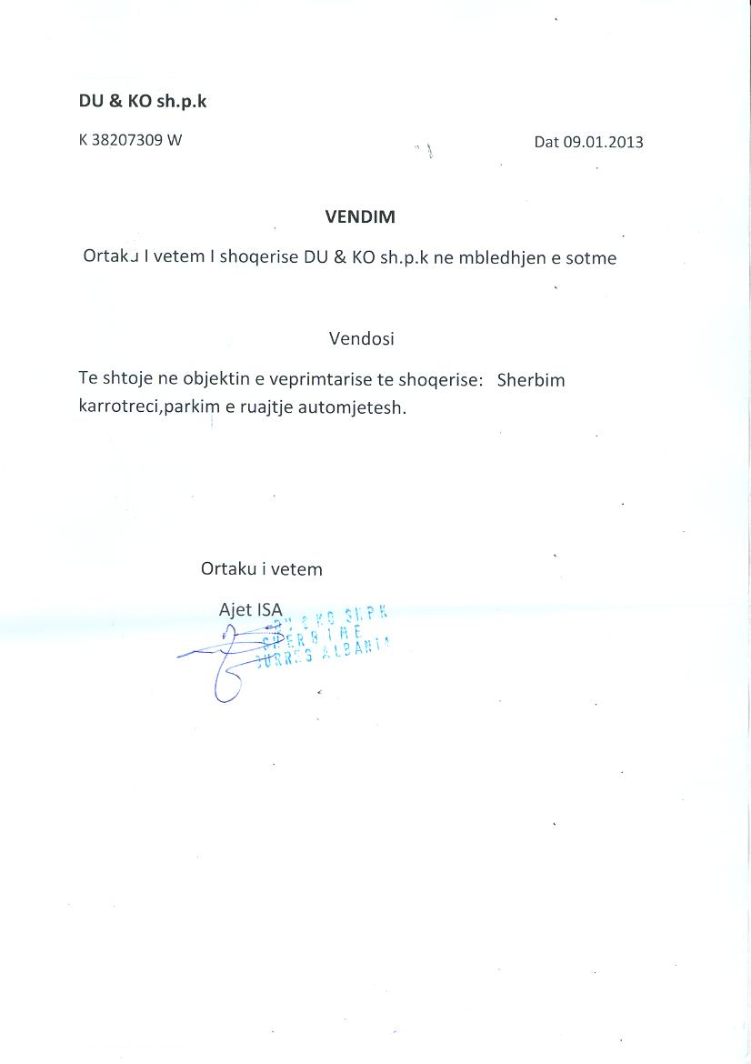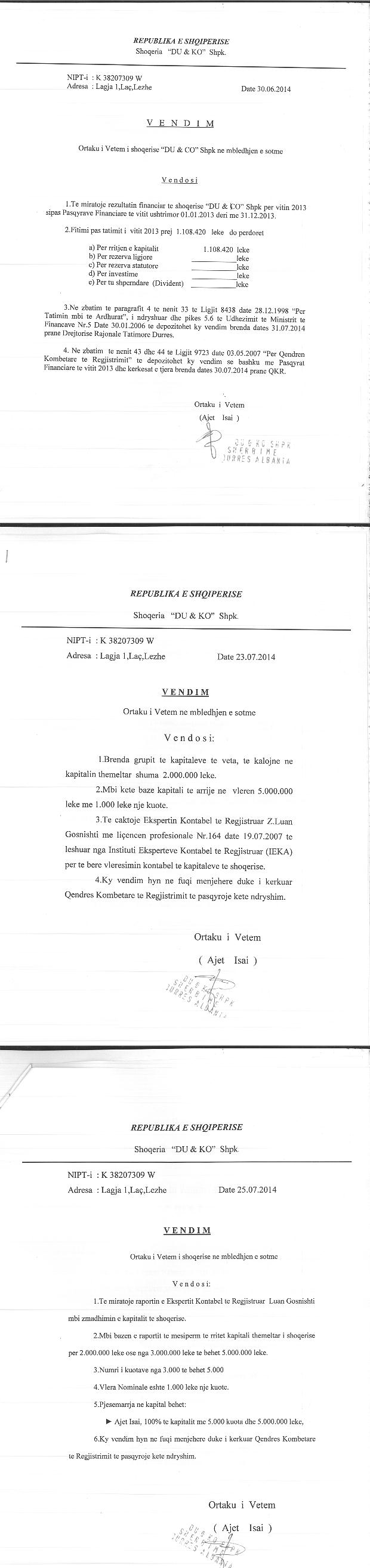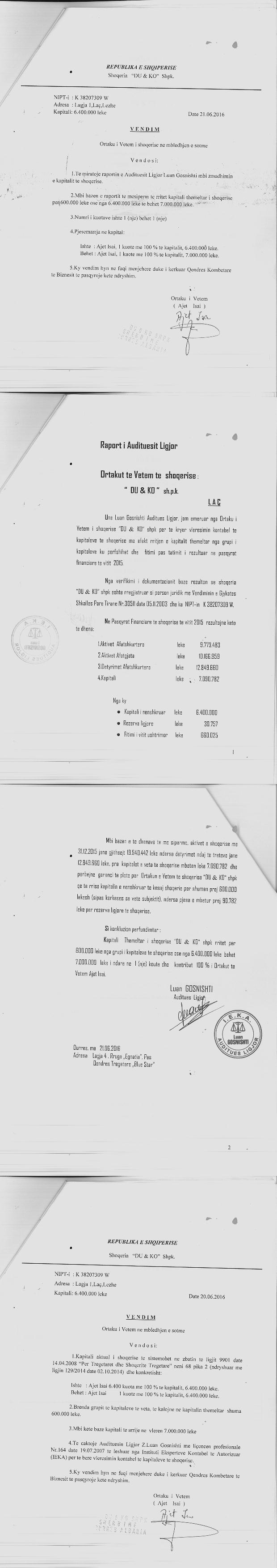 → Ekstrakt Historik i Regjistrit Tregtar, date 10.12.2021 → Kontrata e shitjes se kuotave, date 25.02.2011 → Vendimi i asamblese se ortakeve, date 25.07.2011 → Vendimi i asamblese se ortakeve, date 28.09.2011 → Vendimi i asambleses e ortakeve, date 06.05.2012 → Vendimi i asamblese se ortakeve 09.01.2013 → Vendimi i asamblese se Ortakeve , date 21.03.2013 → Vendimi i asamblese se ortakeve, date 27.03.2013 → Vednimi i asamblese se ortakeve, date 23.07.2014 → Vendimi i asamblese se ortakeve, date 19.06.2015 → Vednimi i asamblese se ortakeve, date 29.06.2018 → Vendimi i asmablese se ortakeve, date 21.06.2016 |