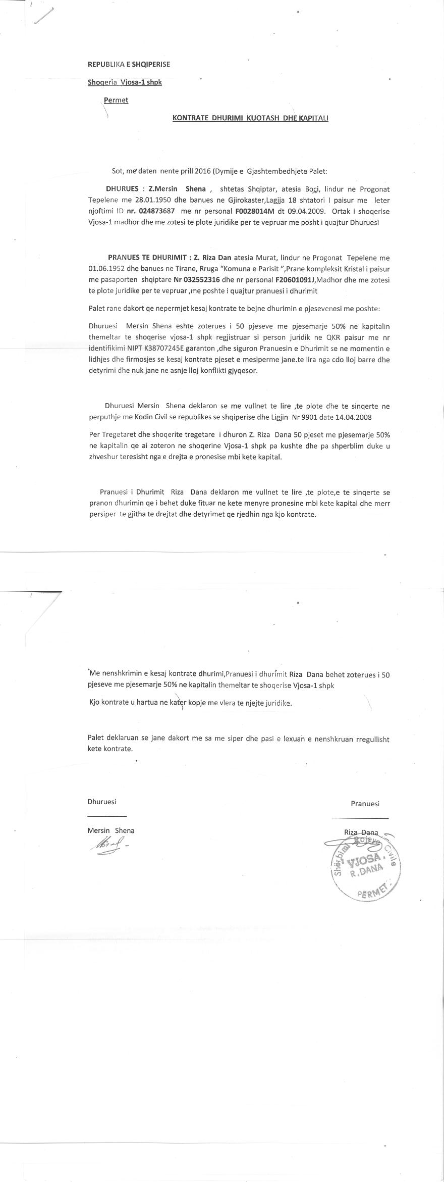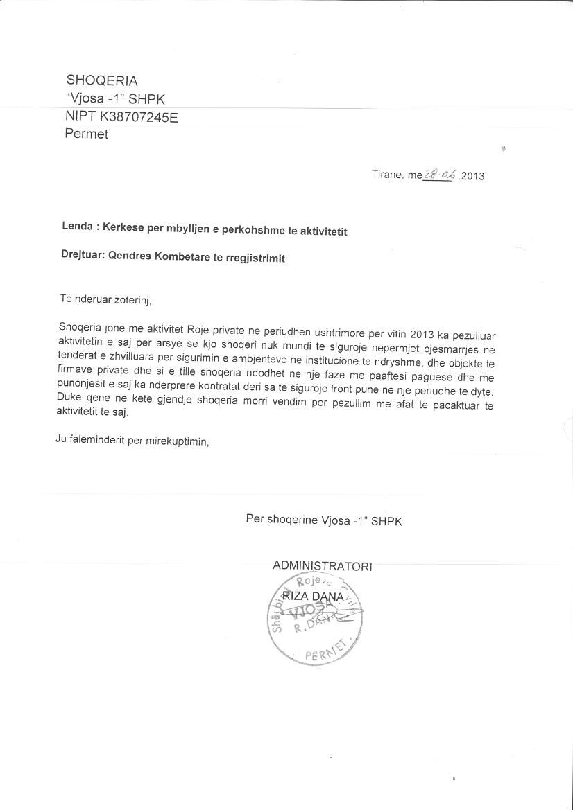 → Ekstrakt historik i regjistrit tregtar date 07.01.2022 → Akti i themelimit dhe statuti → Kontrate dhurimi kuotash date 09.04.2016 → Kerkese per rifllimin e aktivitetit date 30.01.2013 → Kerkese per mbylljen e perkohshme te aktivitetit, date 28.06.2013 → Kerkese per mbylljen e perkohshme te aktivitetit date 27.04.2012 |