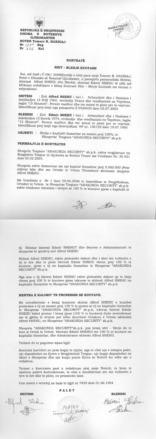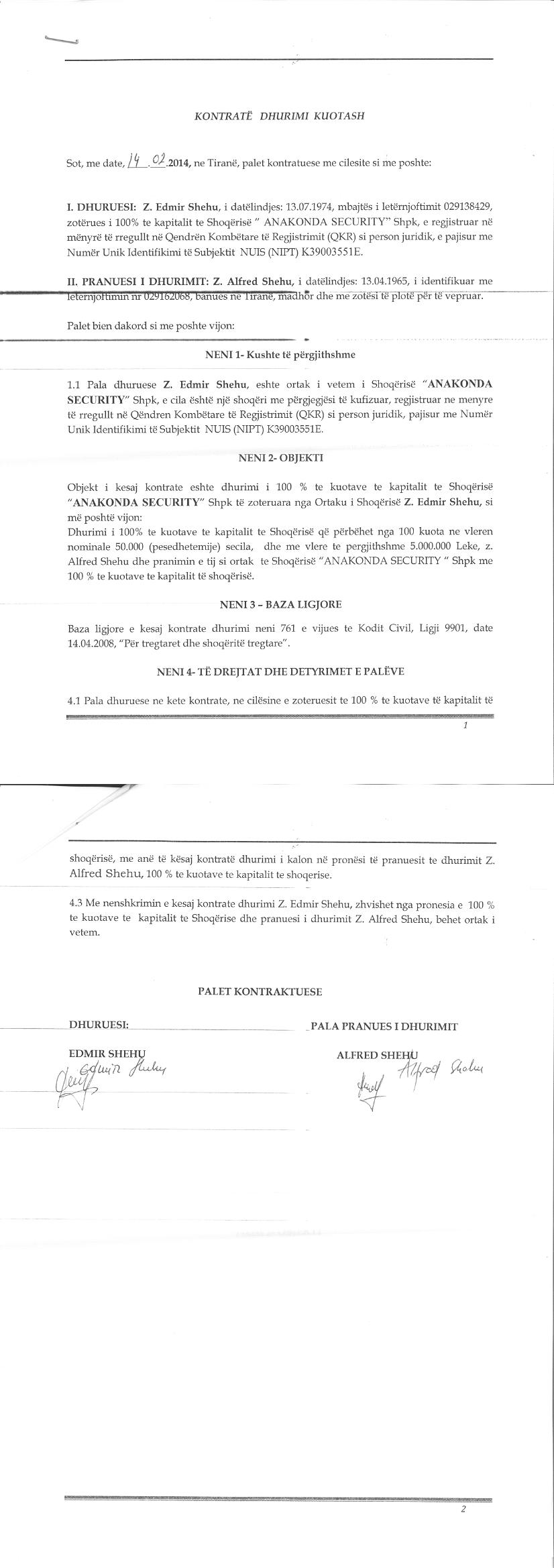 → Ekstrakti Historik i Regjistrit Tregtar date 16.02.2022 → Statuti fillestar i shoqerise dhe dokumenta te ndryshem → Statuti i Shoqerise → Kontrate e Shitjes se Kuotave date 18.06.2008 → Kontrate e Dhurimit te Kuotave date 14.02.2014 |
