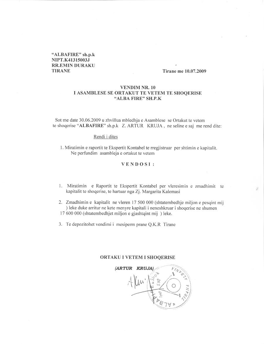 → Ekstrakt historik i regjistrit tregtar date 08.09.2021 → Akti i themelimit dhe statuti → Kontrate dhurimi kuotash date 20.06.2013 → Vendim i ortakut te vetem per zmadhimin e kapitalit date 10.07.2009 → Vendimi i ortakut te vetem per zmadhimin e kapitalit date 30.06.2010 → Vendimi per marrjene overdraftit dhe kontrata e pengut date 28.03.2017 |
