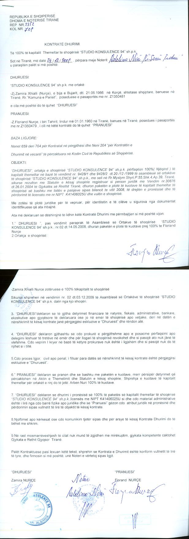 → Ekstrakt historik i regjistrit tregtar date 10.01.2022 → Kontrate dhurimi kuotash date 24.12.2009 |