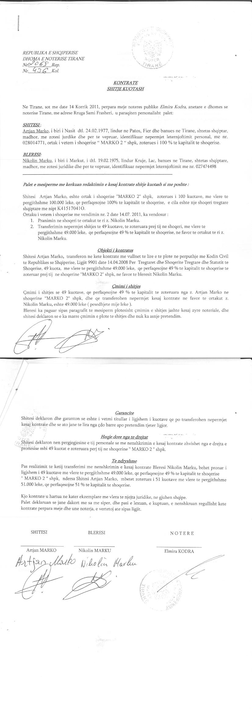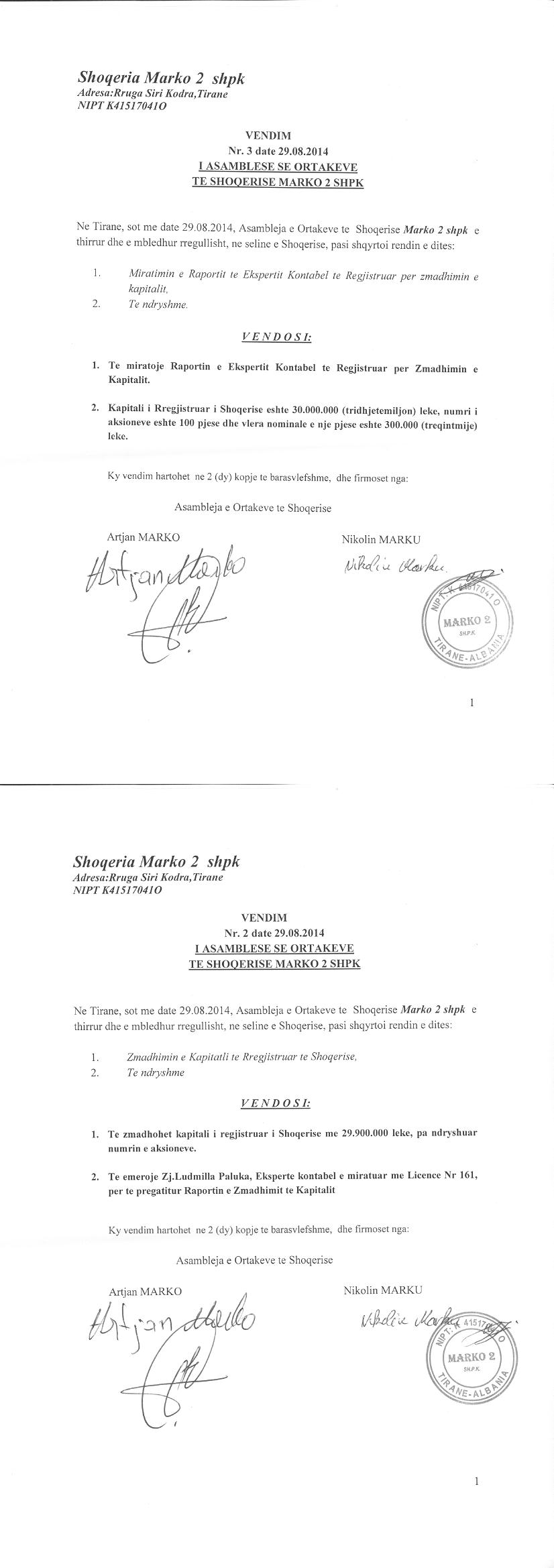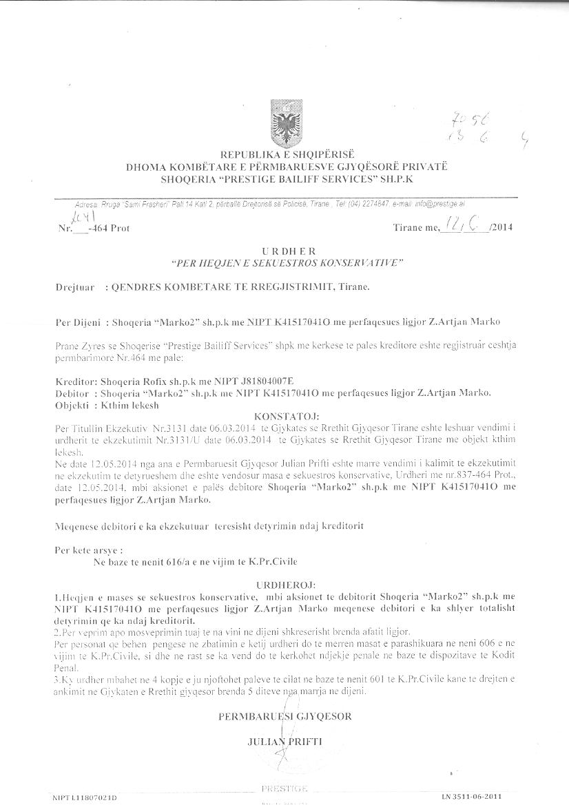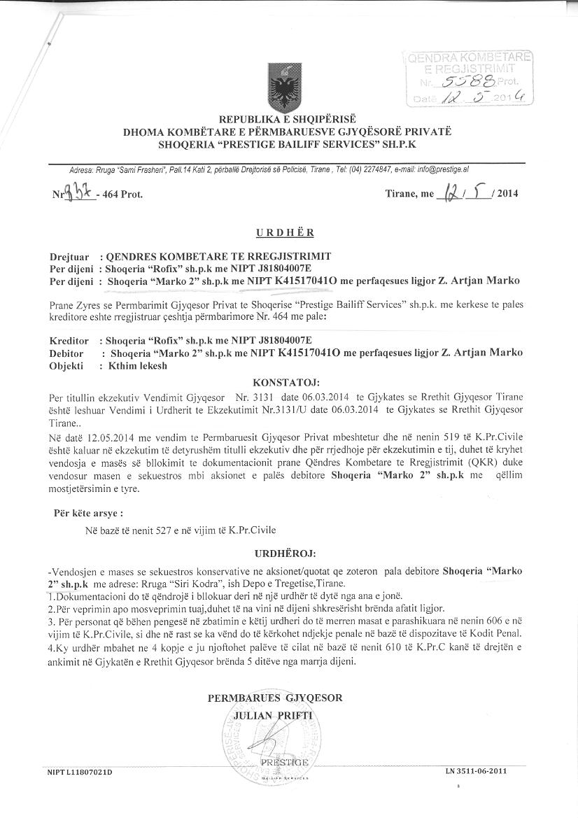 → Ekstrakti Historik i Regjistrit Tregtar date 31.07.2024 → Statuti fillestar i shoqerise dhe dokumenta te ndryshem → Statuti i perditesuar i shoqerise → Urdher date 12.05.2014 → Urdher per heqjen e sekuestros konservative date 12.06.2014 → Urdher per vendosjen e sekuestros konservative date 10.04.2017 → Urdher per heqjen e sekuestros konservative date 04.05.2017 → Urdher per venien e sekuestros konservative date 04.08.2020 → Urdher per heqjen e sekuestros konservative date 12.08.2020 → Urdher per vendosjen e sekuestros konservative date 30.09.2020 → Urdher per venien e sekuestros konservative date 16.05.2022 → Urdher per heqjen e sekuestros konservative date 26.05.2022 → Kerkese per vendosje te mases se sigurimit te detyrimit tatimor date 28.07.2023 → Kerkese per vendosje te mases se sigurimit te detyrimit tatimor date 28.07.2023 → Vendim i Asamblese se ortakeve date 29.08.2014 → Vendim i Asamblese se ortakeve date 25.01.2024 → Kontrate e shitjes se kuotave date 14.07.2011 → Kontrate e shitjes se kuotave date 19.02.2015 → Kontrate e Dhurimit te Kuotave date 29.07.2017 |