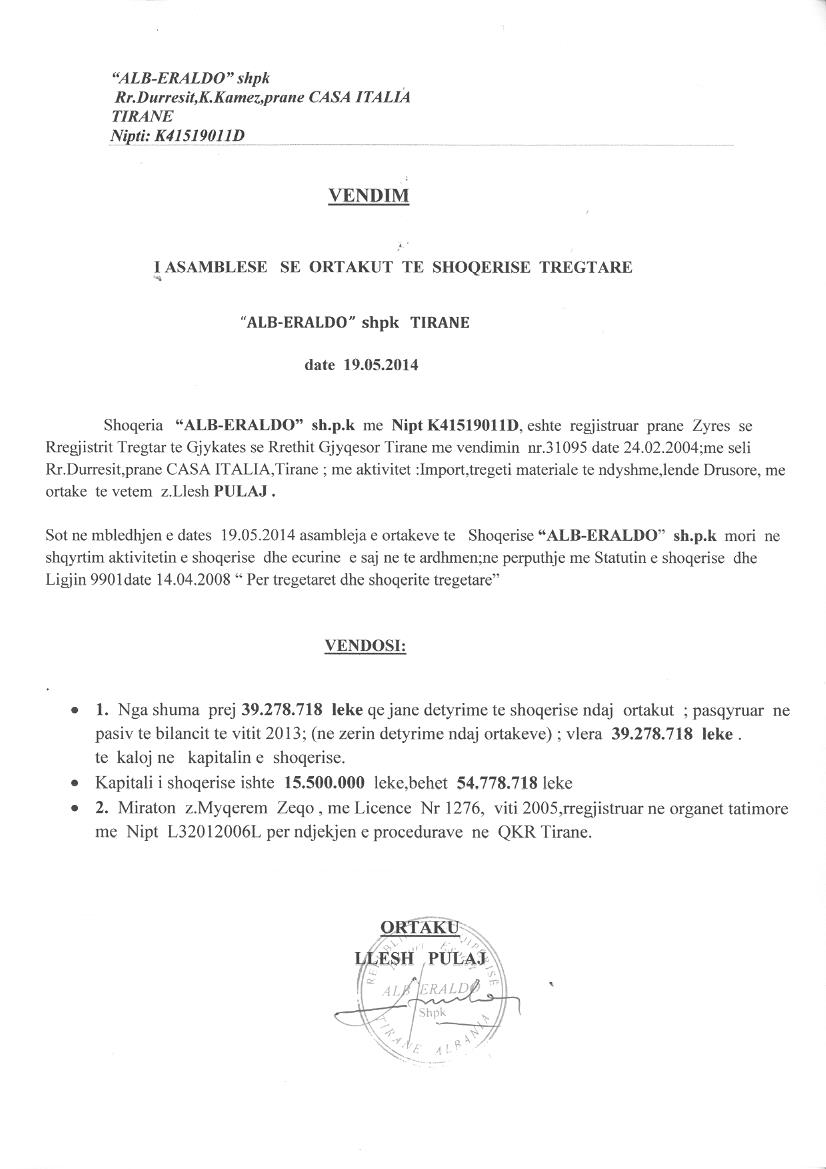 kuotat qe pala debiotre zoteron ne shoqeri te tjera te regjistruara pran regjistrit tregetar. II.Me date 28.06.2016, me ane te urdhrit, Nr. 741/10 Prot, protokolluar nga QKB, me Nr.614 Prot, date: 29.04.2016, lëshuar nga shoqeria permbarimore “Kodra Bailiff Service”, eshte urdheruar: Heqja e mases se sekuestros konsservative mbi aktivin e debitorit “ Alb-Eraldo”, me NUIS K41519011D. |