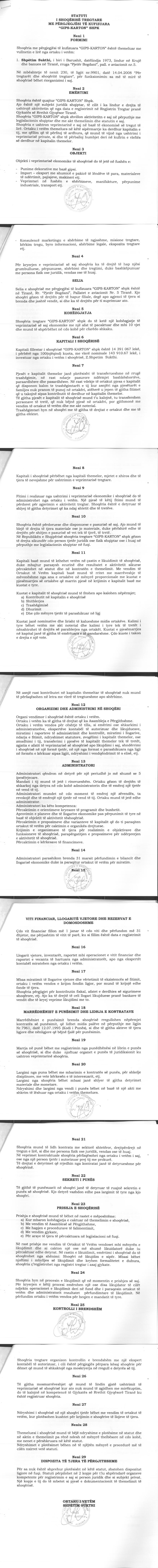 → Ekstrakti Historik i Regjistrit Tregtar date 19.06.2024 → Akti i themelimit te Shoqerise dhe dokumenta te ndryshem → Statuti i perditesuar i shoqerise → Raport per zmadhimin e kapitalit date 27.06.2008 |