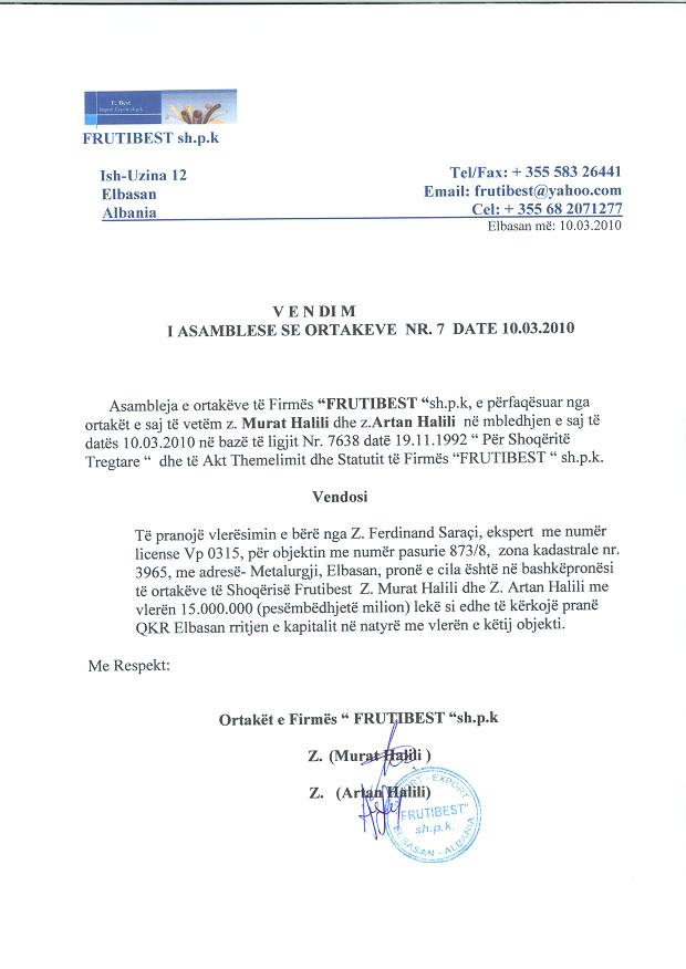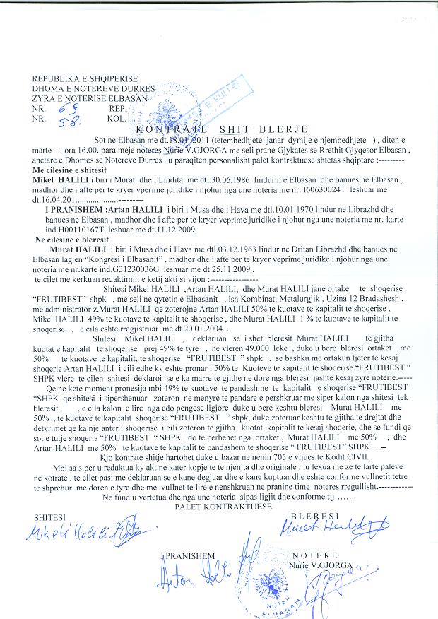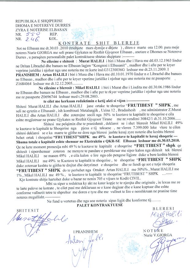→ Ekstrakt historik i regjistrit tregtar 10.02.2022 → Akti i themelimit → Kontrate shitje 11.10.2006 → Vendimi i asamblese se ortakeve per zmadhimin e kapitalit 10.03.2010 → Kontrate shit-blerje 30.03.2010 → Kontrate shit-blerje 18.01.2011 → Vendimi i asamblese se ortakeve per zmadhimin e kapitalit 11.05.2018 |