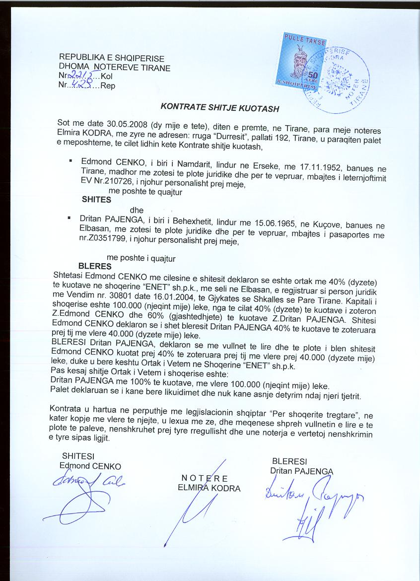 → Ekstrakti Historik i Regjistrit Tregtar date 08.03.2023 → Kontrate Shitje Kuotash date 30.05.2008 → Urdher per Venie Sekuestro date 17.11.2016 → Urdher per Venie Sekuestro date 20.07.2017 → Urdher per Venie Sekuestro date 15.08.2017 → Urdher per Heqje Sekuestro date 23.05.2018 → Urdher per Venie Sekuestro date 10.05.2019 → Urdher per Venie Sekuestro date 17.05.2019 → Urdher per Heqje Sekuestro date 22.11.2019 |