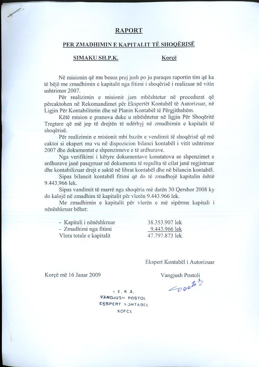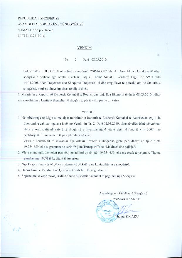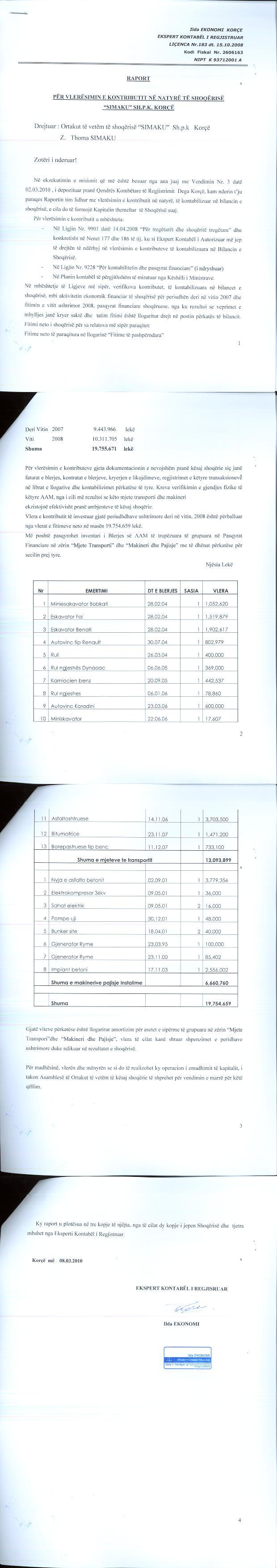 → Ekstrakt historik i regjistrit tregtar 22.06.2021 → Dokumenta te ndryshem (Akti I themelimit, Vendimet per rritje kapitali) → Raport per vleresimin e kontributit ne natyre (08.03.2010) → Raport per zmadhimin e kapitalit te shoqerise (16.01.2009) → Urdher per venien e sekuestros (16.11.2018) → Vendim I asamblese per rritje kapitali (08.03.2010) |