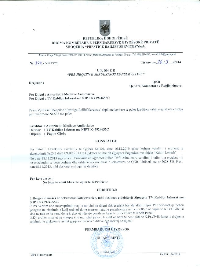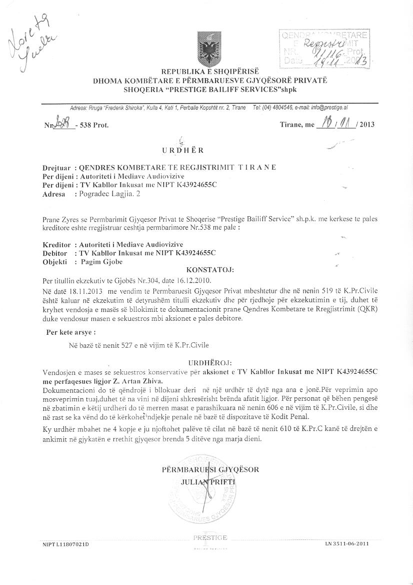 | Çështje Ligjore: | I. Me date 18.11.2013, me ane te Urdhrit Nr.2028-538Prot, "Per Venien e Sekuestros Konservative”, leshuar nga Shoqeria “Prestige Bailiff Services” shpk, drejtuar QKR, u urdherua vendosja e mases se sekuestros konservative per aksionet e TV Kabllor Inkusat me NIPT K43924655C me perfaqesues ligjor Z.Artan Zhiva.Dokumentacioni do te qendroje i bllokuar deri ne nje urdher te dyte nga ana e jone. II. Me date, 26.05.2014, me ane te Urdhrit Nr.244-538 Prot, lëshuar nga Shoqëria Përmbarimore “Prestige Bailiff Services” sh.p.k, u urdherua heqja e masës së sekuestros konservative mbi aksionet e debitorit "TV Kabllor Inkusat" me NIPT K43924655C. |