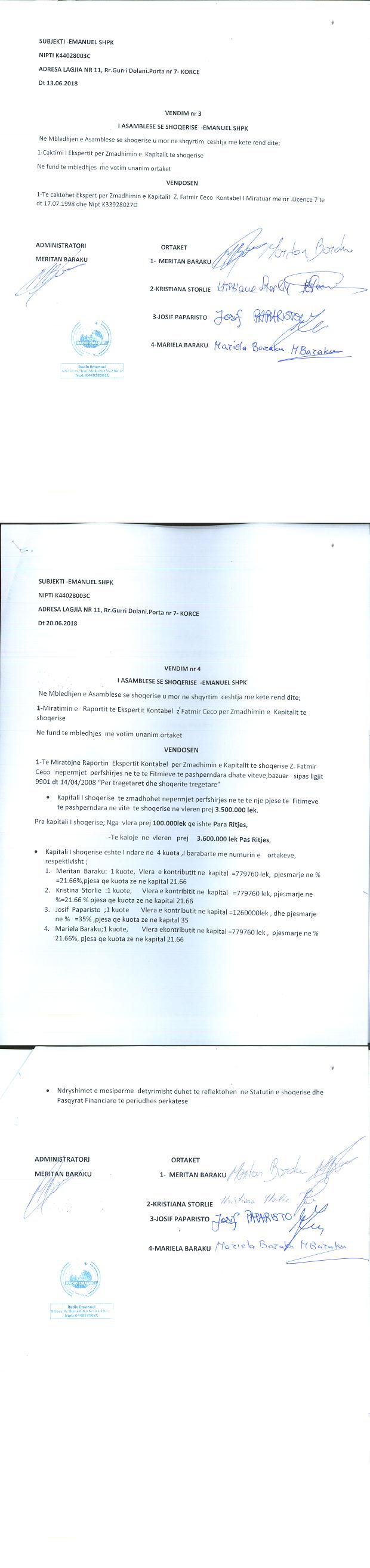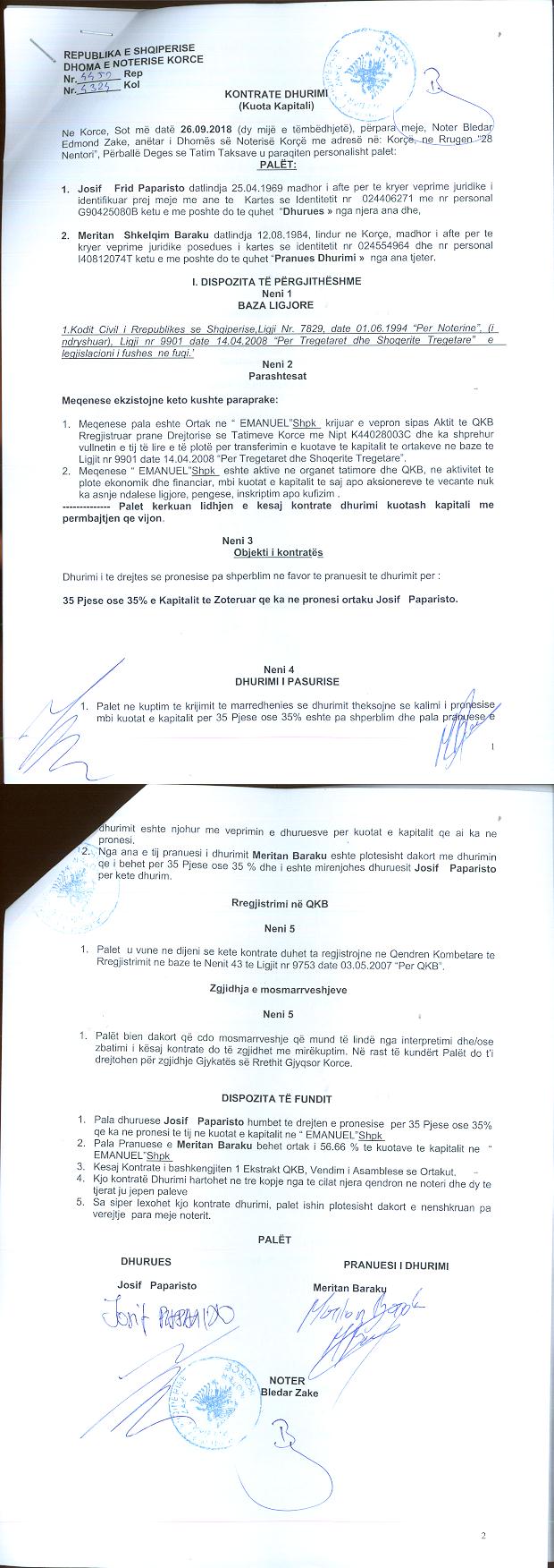 → Ekstrakt historik i regjistrit tregtar date 28.01.2023 → Akti i themelimit dhe statuti → Vendimi i asamblese se ortakeve per miratimin e raportit te zmadhimin te kapitalit date 20.06.2018 → Kontrate dhurimi date 26.09.2018 |