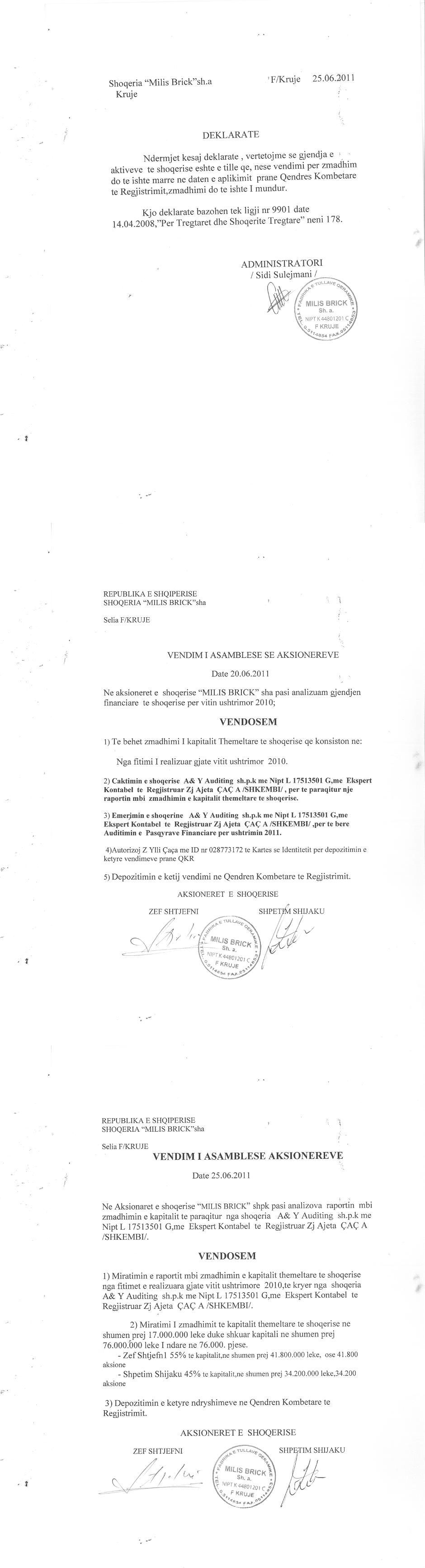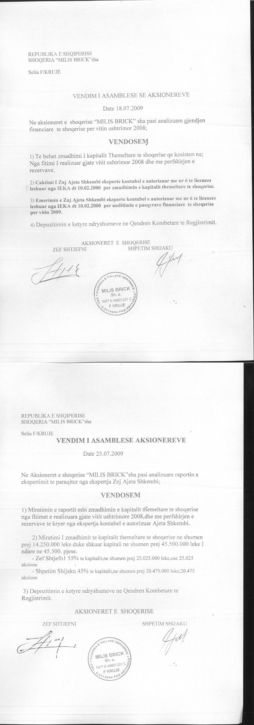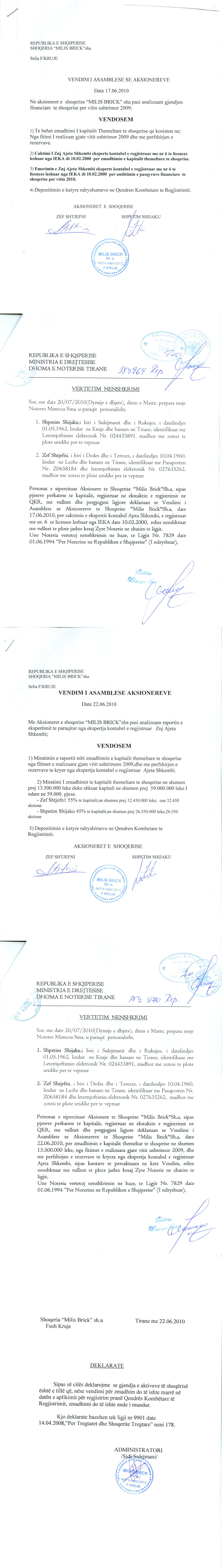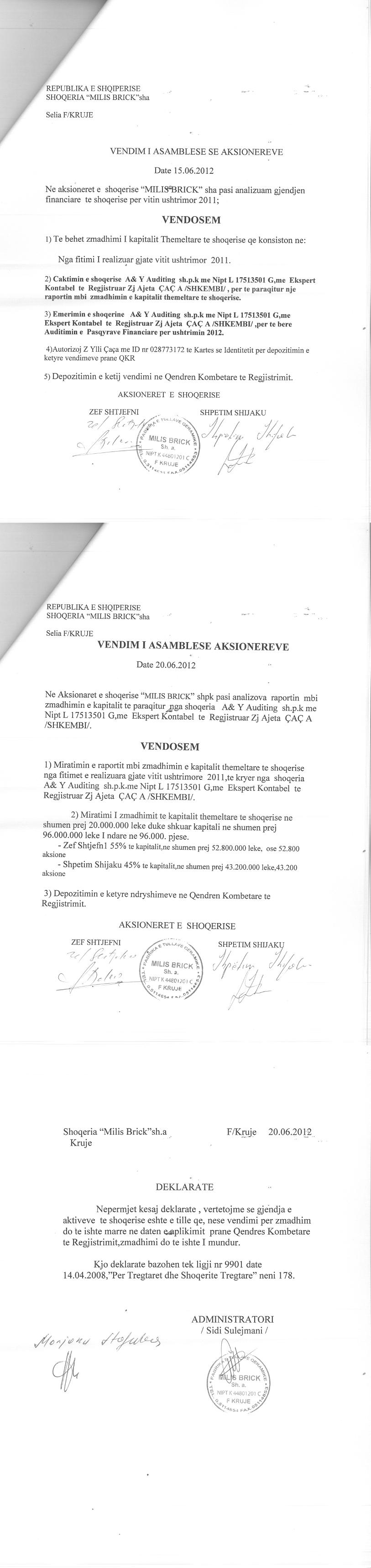 → Ekstrakti Historik i Regjistrit Tregtar date 29.08.2024 → Statuti fillestar i shoqerise dhe dokumenta te ndryshme → Statuti i perditesuar i Shoqerise → Vendim i Asamblese se Aksionereve date 25.07.2009 → Vendim i Asamblese se Aksionereve date 22.06.2010 → Vendim i Asamblese se Aksionereve date 25.06.2011 → Vendim i Asamblese se Aksionereve date 20.06.2012 → Vendim i Asamblese se shoqerise date 08.08.2014 → Vendim i Asamblese se Aksionereve date 27.03.2024 → Urdher per vendosjen e sekuestros konservative date 03.06.2013 → Urdher per venien e sekuestros konservative date 17.03.2016 → Vendim per pushimin e ekzekutimit date 21.03.2016 → Vendim i Gjykates se Rrethit Gjyqesor Kruje date 25.11.2013 → Vendim i Gjykates se Rrethit Gjyqesor Kruje date 03.09.2013 |