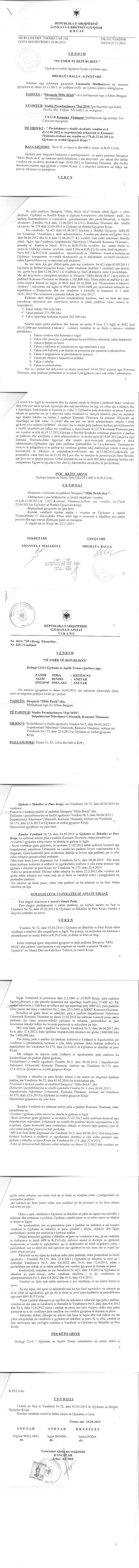 | Çështje Ligjore: | I.Me date 03.06.2013, me ane te Urdhrit Nr.820-338 Prot., lëshuar nga Zyra përmbarimore "FAT-2010" SH.P.K., është urdhëruar:Vendosja e Sekuestros Konservative mbi aksionet e debitorit, shoqëria “MILIS BRICK”sh.a, me NUIS(NIPT) K44801201C. II.Me date 22.06.2012, ane te vendimit Nr.Regjistrit Themeltar Nr.421 Vendimi, date 03.09.2013 te Gjykates se Rrethit Gjyqesor Kruje. Me pale Paditese : “MILIS BRICK “ sh.a dhe Pale e Paditur “Inspektoriati Ndertimore Urbanistik Komuna Thumane”, eshte vendosur : - Pranimi pjeserisht i kerkese-padise se p/ paditese Shoqeria “MILIS BRICK “ sh.a. – Anullimi i aktit administrative, vendim per denim me gjobe nr.5 date 06.06.2012 dhe nr.6 date 12.06.2012. III.Me date 25.11.2013, me ane te vendimit, Nr.543,, të Gjykatës Rrethit Gjyqësor, Krujë, është vendosur: - Pranimi i kërkesës së paditësit, Shoqëria “MILIS BRICK SHA”. – Deklarimi i pavleshmërisë së titullit ekzekutiv vendim nr.6, datë 12.06.2012, te I.N.U., Komuna Thumanë, lëshuar me vendimin nr.176, datë 22.04.2013, të Gjykatës së Apelit Krujë. Depozitimi i vendimit, Nr. 835, datë 14.04.2015, të Gjykatës së Apelit, Tiranë, ku është vendosur: - Lëna në fuqi të vendimit Nr.72, datë 03.03.2014, të Gjykatës Rrethit Gjyqësor Krujë, i cili ka vendosur: Pranimi i kërkesës së paditësit, Shoqëria “MILIS BRICK SHA”. – Deklarimin e pavleshmërisë së titullit ekzekutiv vendimi nr.5, datë 06.06.2012, të I.N.U., Komuna Thumanë, lëshuar me vendimin nr.175, datë 22.04.2013, të Gjykatës së Rrethit Gjyqësor Krujë. IV.Me date 17.03.2016, me ane te Urdhrit Nr.389-Prot, Nr.632 Dosje, lëshuar nga Permbaruas gjyqesorë Privat “ ALTIN VAKO ", protokulluar ne Q.K.R me Nr.2731, Datë 18.03.2016, është urdhëruar: Vendosja e masës së sekuestros konservative mbi te gjitha aksionet qe zotron pala debitore " MILIS BRICK " Sh.a, me NUIS(NIPT) K44801201C. V.Me date 21.03.2016, me ane te urdhrit Nr.421 Prot, Nr.623 Dosje, lëshuar nga Zyra Përmbarimore Private “Altin Vako", drejtuar QKR, ështe urdhëruar: Zhbllokimi i aksioneve apo kredive të shoqërisë “MILIS BRICK SHA”, me NIPT K44801201C dhe Z.Alush Dizdari, të bllokuara me anë të shkresës Nr.389 Prot, datë 17.03.2016, të Përmbaruesit Gjyqësor Altin Vako. |