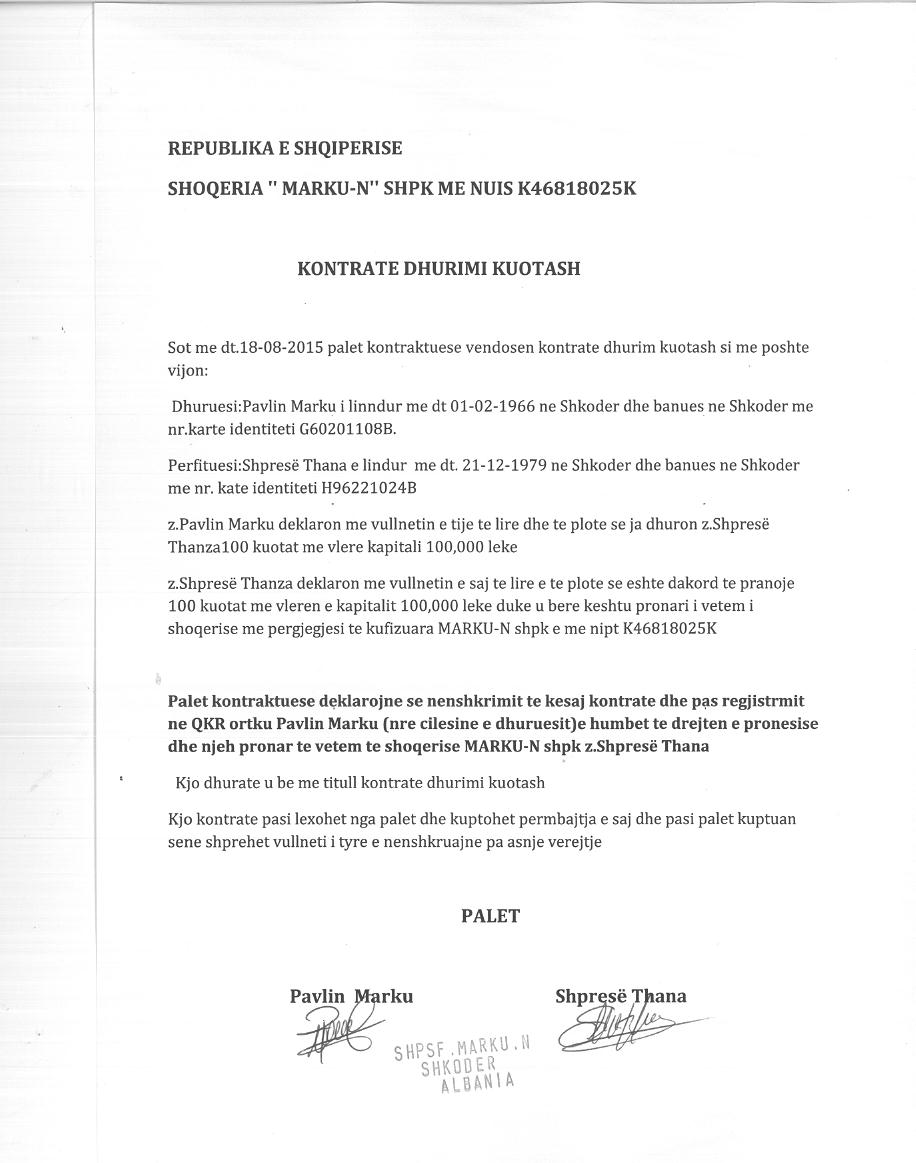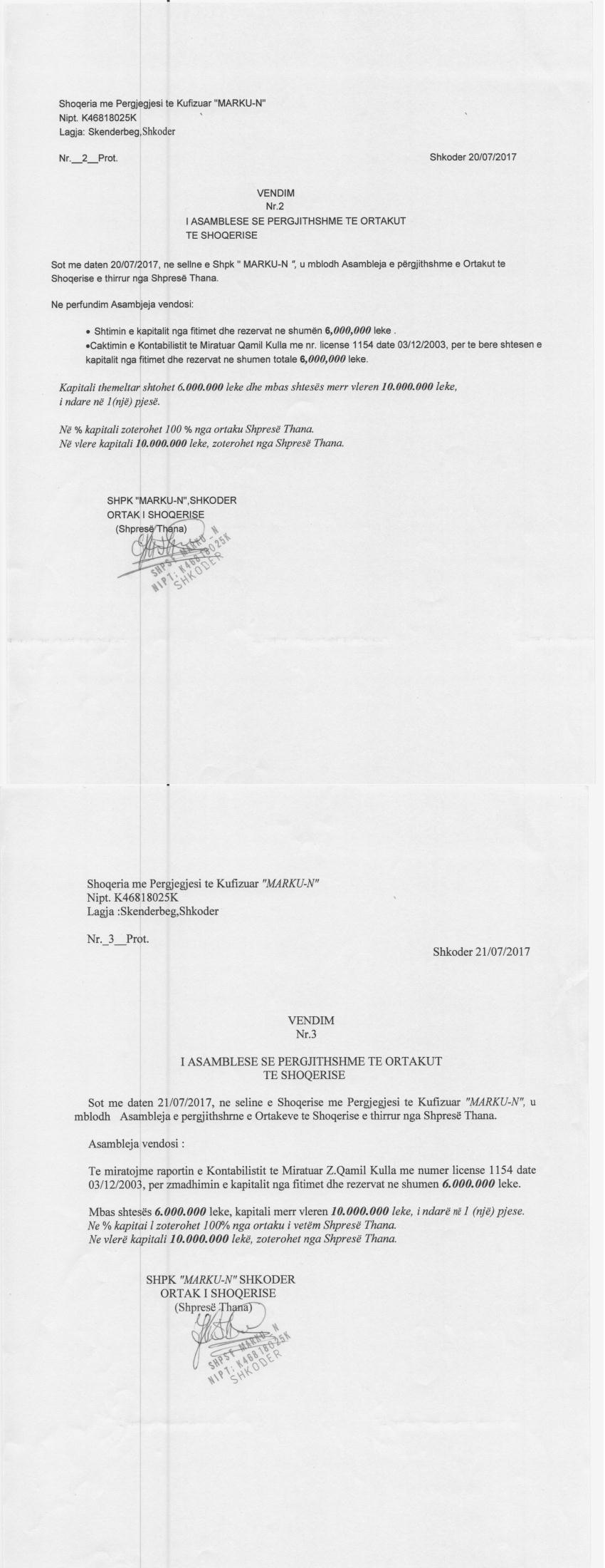 → Ekstrakt historik i regjistrit tregtar 11.02.2021 → Akti i themelimit → Vendimi i ortakut te vetem per mbylljen e aktivitetit 29.04.2020 → Kontrate dhurimi kuotash 18.08.2015 → Vendimi i asamblese se ortakut per shtimin e kapitalit 20.07.2017 |
