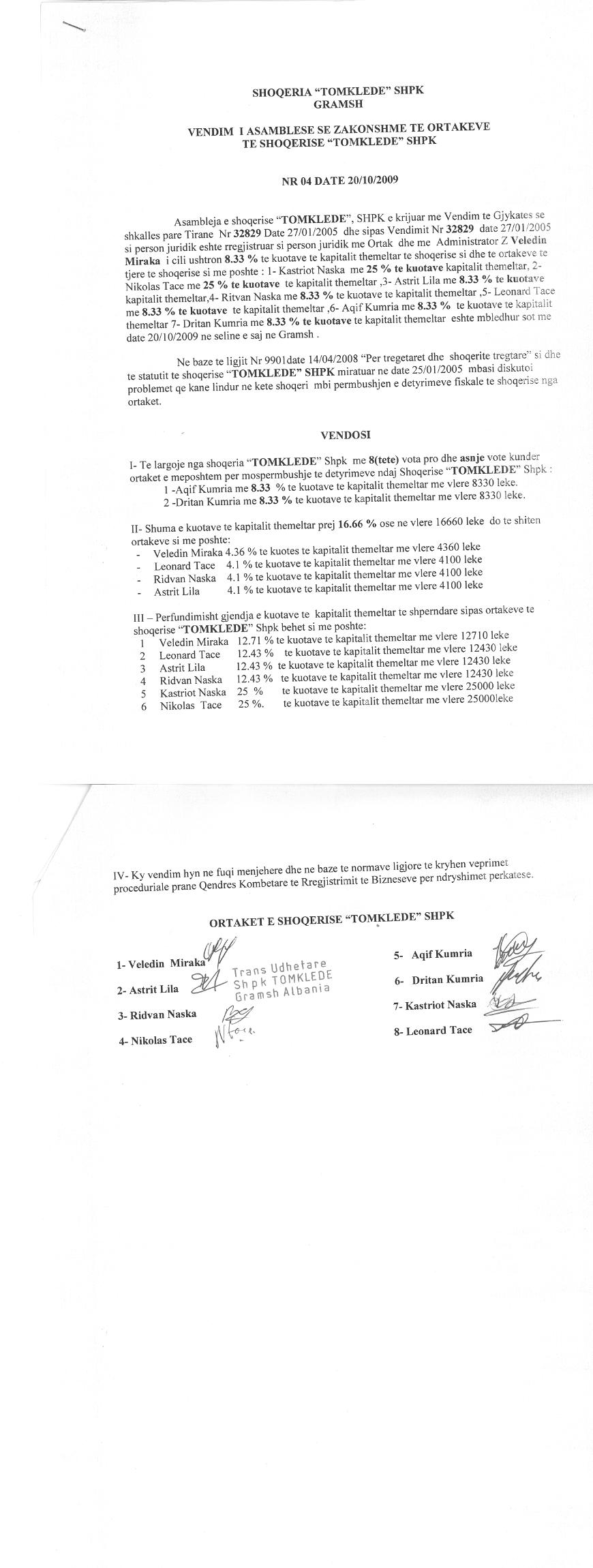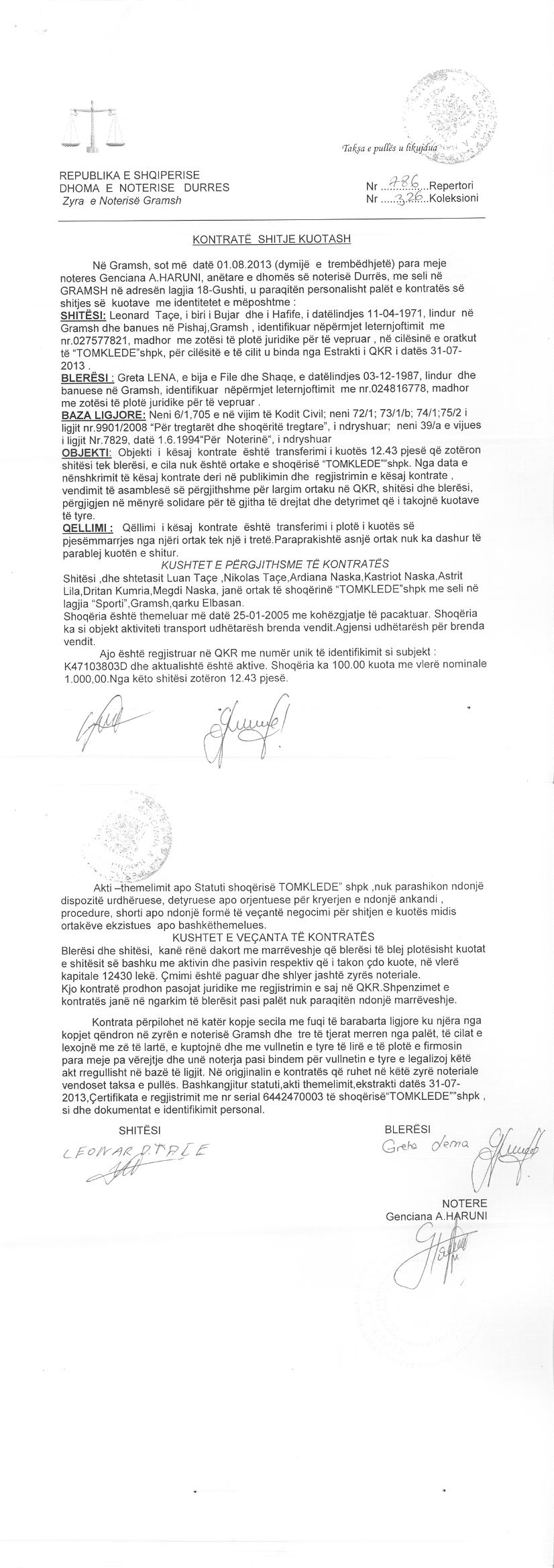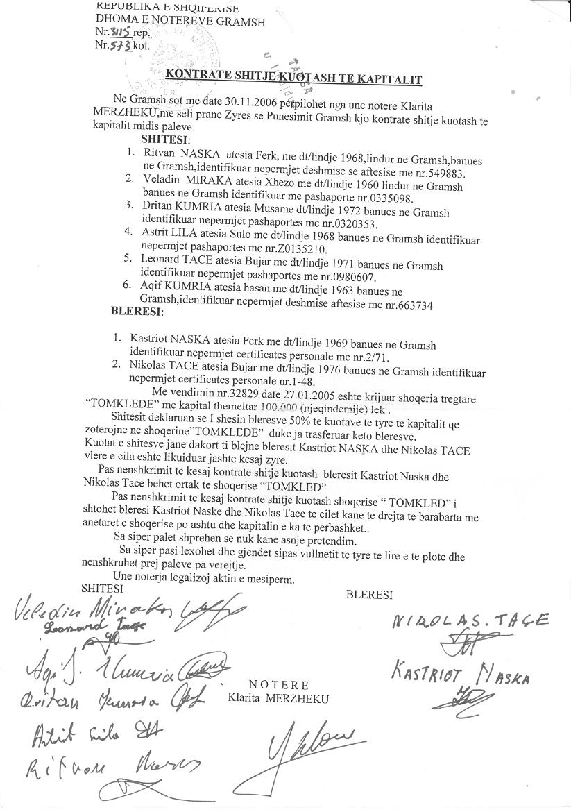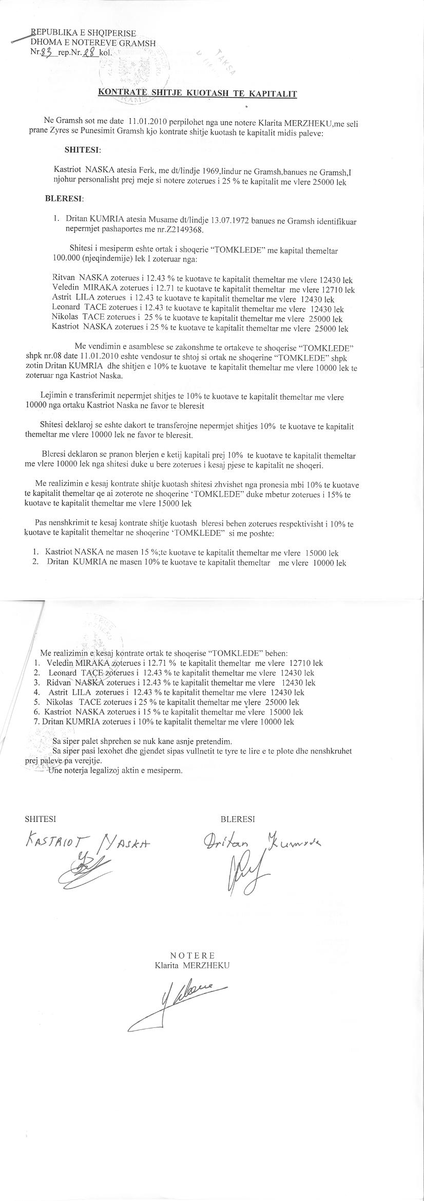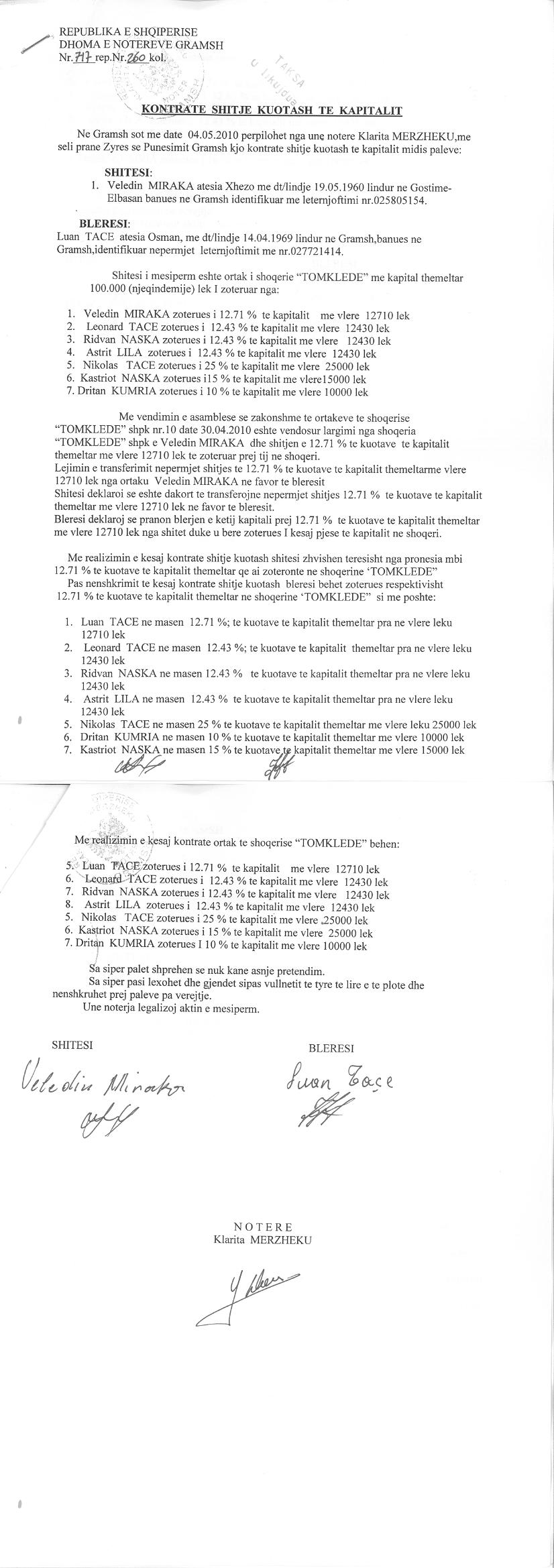 → Ekstrakt historik i regjistrit tregtar 12.10.2021 → Akti i themelimit te shoqerise → Kontrate shitje kuotash 14.03.2019 → Kontrate shitje kuotash 11.01.2010 → Kontrate shitje kuotash 04.05.2010 → Kontrate shitje kuotash 01.08.2013 → Kontrate shitje kuotash 30.11.2006 → Kontrate shitje kuotash 07.03.2019 → Vendimi per largimin e ortakeve 20.10.2009 |