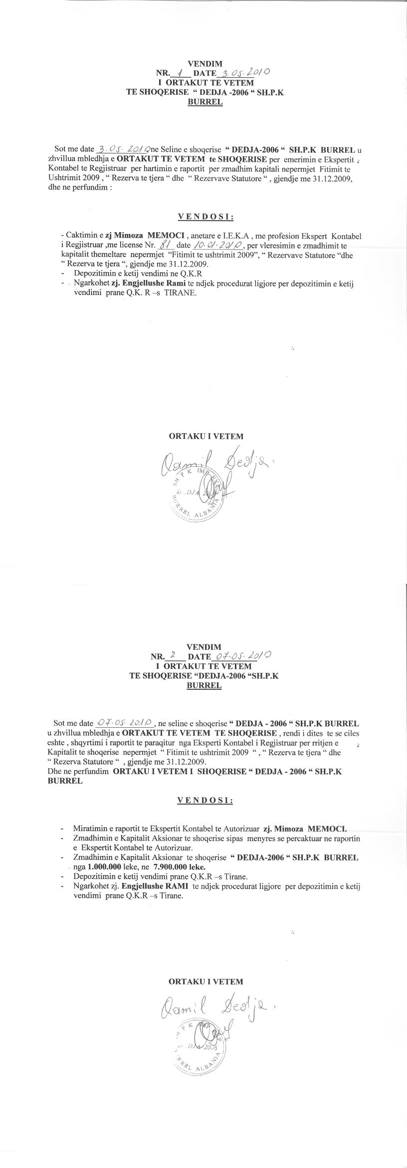 → Ekstrakt historik i regjistrit tregtar date 10.12.2021 → Akti i themelimit dhe statuti → Vendimi i ortakut te vetem per zmadhimin e kapitalit date 03.05.2010 |