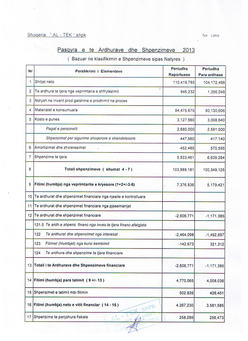 6 517 106,00 Fitimi para Tatimit(Lekë) 2018: 6 382 472,00 Fitimi para Tatimit(Lekë) 2017: 4 824 565,00 Fitimi para Tatimit(Lekë) 2016: 6 472 780,00 Fitimi para Tatimit(Lekë) 2015: 7 853 720,00 Fitimi para Tatimit(Lekë) 2014: 4 739 562,00 Fitimi para Tatimit(Lekë) 2013: 4 770 065,00 Fitimi para Tatimit(Lekë) 2012: 4 008 036,00 |
