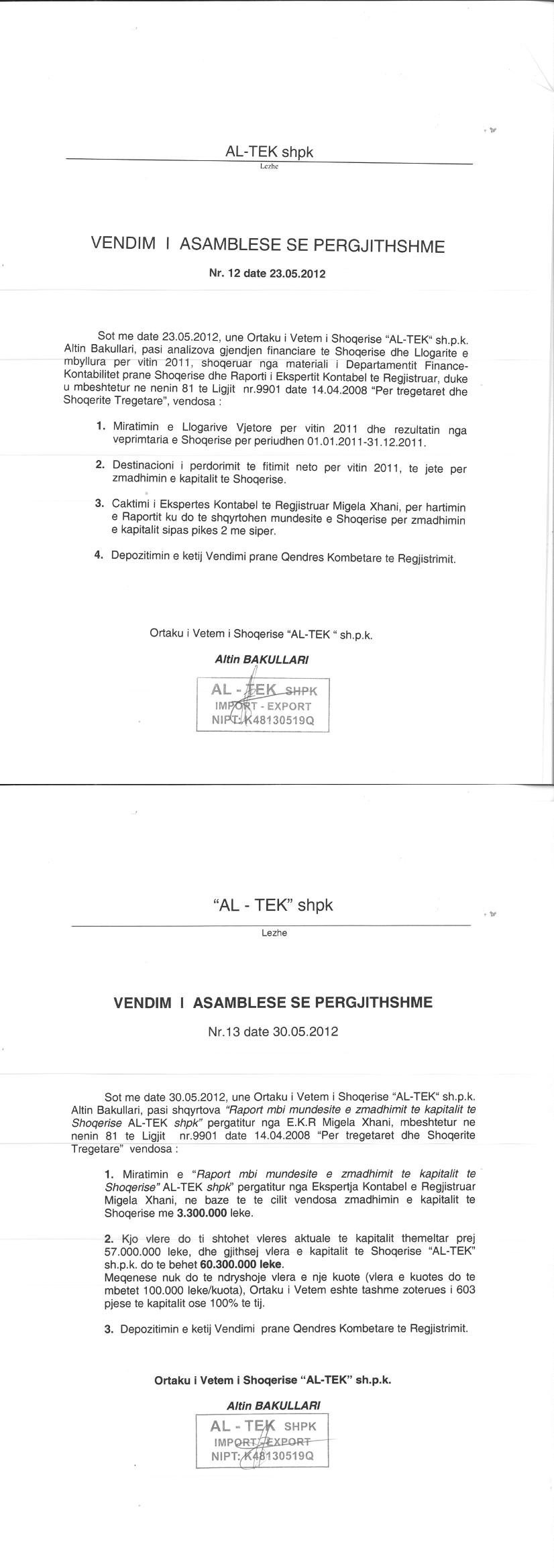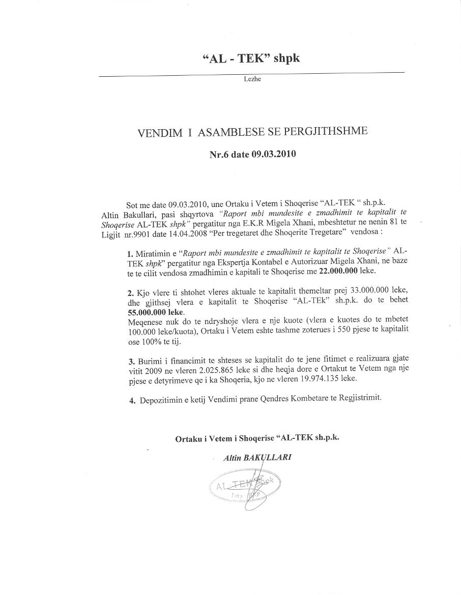 → Ekstrakt historik i regjistrit tregtar 12.04.2021 → Akti i themelimit → Vendim i asamblese se pergjithshme per zmadhimin e kapitalit 07.05.2018 → Vendim i asamblese se ortakeve per zmadhimin e kapitalit 09.03.2010 → Vendim i ortakut te vetem per zmadhimin e kapitalit 23.05.2012 → Vendim i ortakut te vetem per zmadhimin e kapitalit 09.12.2020 → Vendim i asamblese se pergjithshme per zmadhimin e kapitalit 10.05.2016 → Vendim i ortakut te vetem per rritjen e kapitalit 11.05.2015 |
