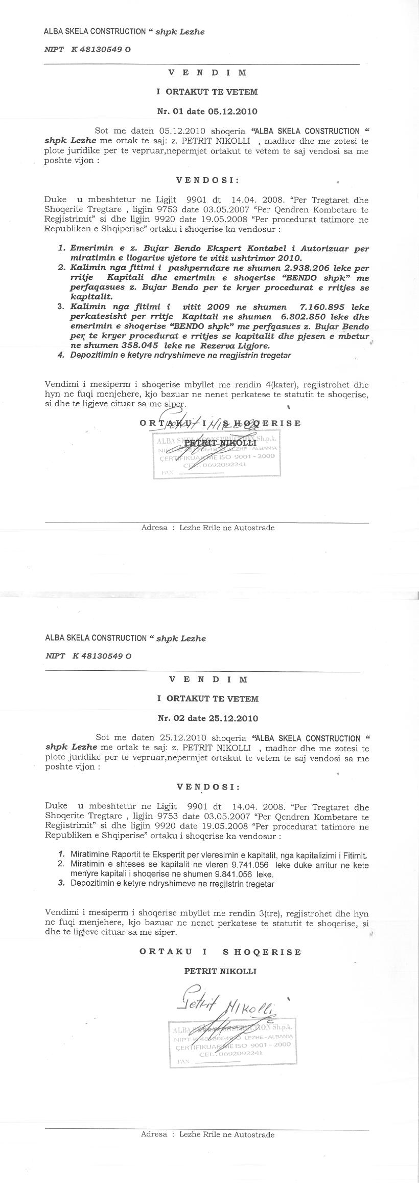 → Ekstrakt Historik i Regjistrit Tregtar date 01.06.2024 → Kontrate per themelimin e Shoqerise → Statuti i Shoqerise → Dokumente te Ndryshme → Kontratë Shitje Kapitali datë 13.04.2005 → Vendim i Ortakut të Vetëm, Zmadhim Kapitali datë 05.12.2010 → Vendim i Ortakut të Vetëm, Zmadhim Kapitali datë 10.06.2011 → Vendim i Ortakut të Vetëm, Zmadhim Kapitali datë 10.04.2012 → Vendim i Ortakut të Vetëm, Zmadhim Kapitali datë 15.04.2013 → Kontratë Shit-Blerje Kuotash datë 30.09.2015 → Vendim i Ortakut të Vetëm, Zmadhim Kapitali datë 18.07.2016 → Vendim i Ortakut të Vetëm, Zmadhim Kapitali datë 27.05.2017 → Vendim i Ortakut të Vetëm, Zmadhim Kapitali datë 10.07.2018 → Vendim i Ortakut të Vetëm, Zmadhim Kapitali datë 22.07.2019 → Vendim i Asamblesë së Ortakut të Vetëm, Zmadhim Kapitali datë 18.08.2022 |