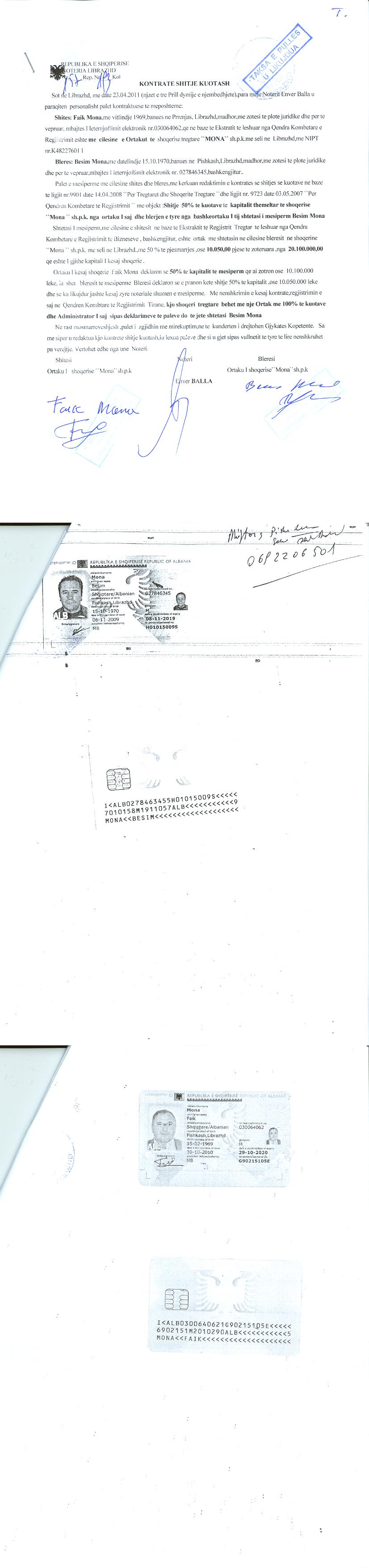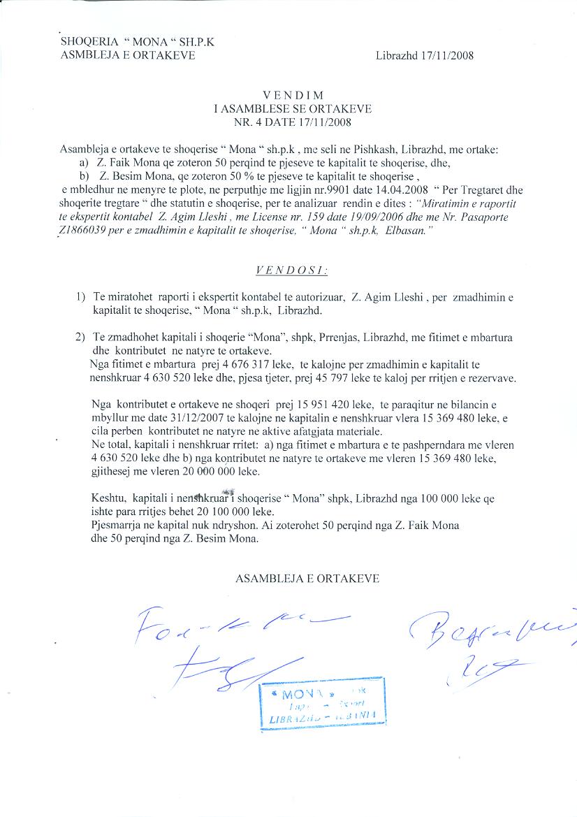 → Ekstrakt historik i regjistrit tregtar date 12.11.2021 → Kontrate shitje kuotash date 23.04.2011 → Vendimi i asamblese se ortakeve per zmadhimin e kapitalit date 17.11.2008 |