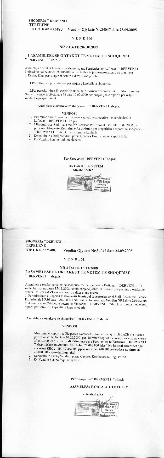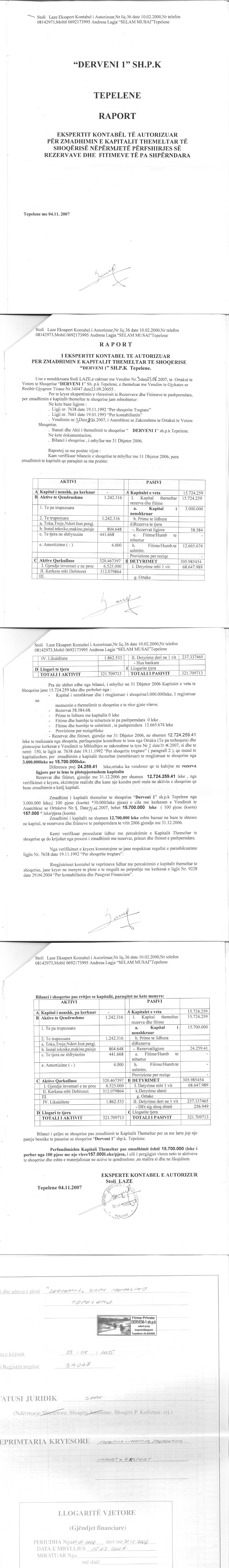 → Ekstrakt historik i regjistrit tregtar date 06.12.2021 → Statuti i shoqerise → Raporti i ekspertit kontabel per rritjen e kapitalit date 24.06.2007 → Vendimi i ortakut te vetem per fillimin e procedurave te zmadhimit te kapitalit date 28.10.2008 |