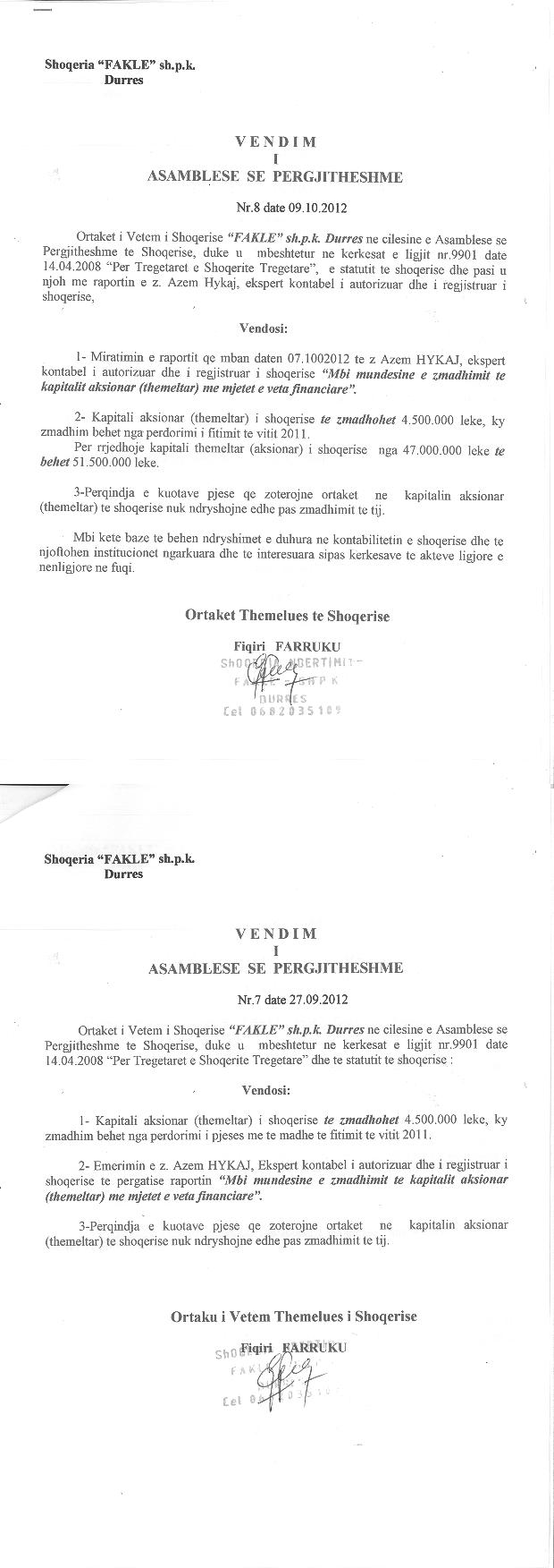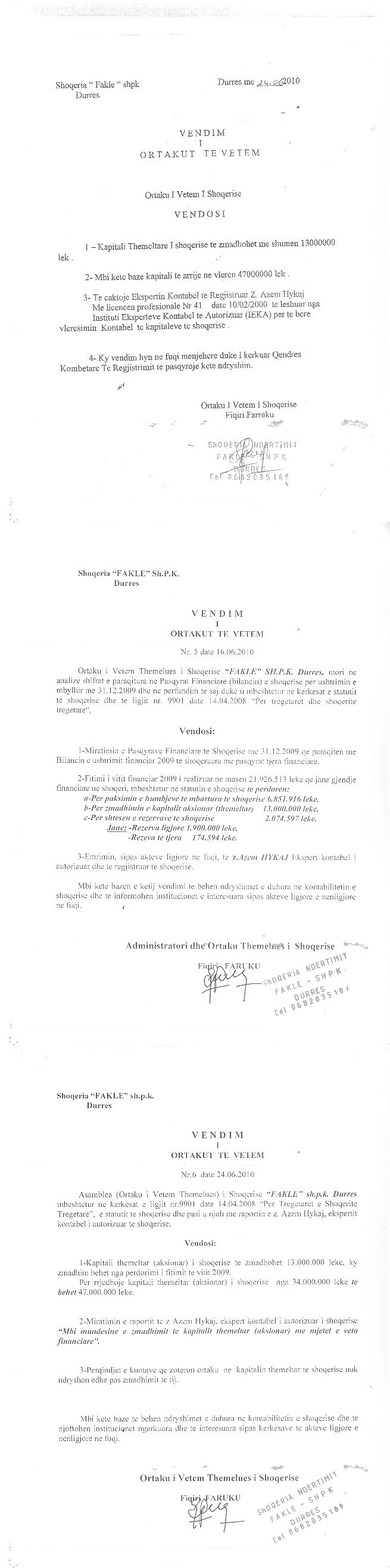→ Ekstrakti Historik i Regjistrit Tregtar date 07.06.2023 → Akt themelimi dhe Statuti i Shoqerise → Vendim i Ortakut te Vetem, Zmadhim Kapitali date 15.06.2007 → Vendim i Ortakut te Vetem, Zmadhim Kapitali date 24.06.2010 → Vendim i Ortakut te Vetem, Zmadhim Kapitali date 09.10.2012 → Vendim i Ortakut te Vetem, Zmadhim Kapitali date 18.07.2017 → Vendim i Ortakut te Vetem, Zmadhim Kapitali date 18.07.2018 → Vendim i Ortakut te Vetem, Zmadhim Kapitali date 08.07.2019 → Urdher per Bllokimin e Licenses date 31.10.2019 → Urdher per Zhbllokimin e Licenses date 12.02.2020 → Kerkese per Vendosjen e Masës së Sigurimit të Detyrimit Tatimor date 03.12.2020 → Kerkese per Vendosjen e Masës së Sigurimit të Detyrimit Tatimor date 12.08.2021 |