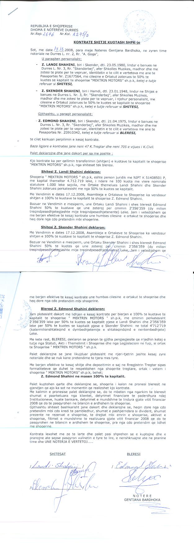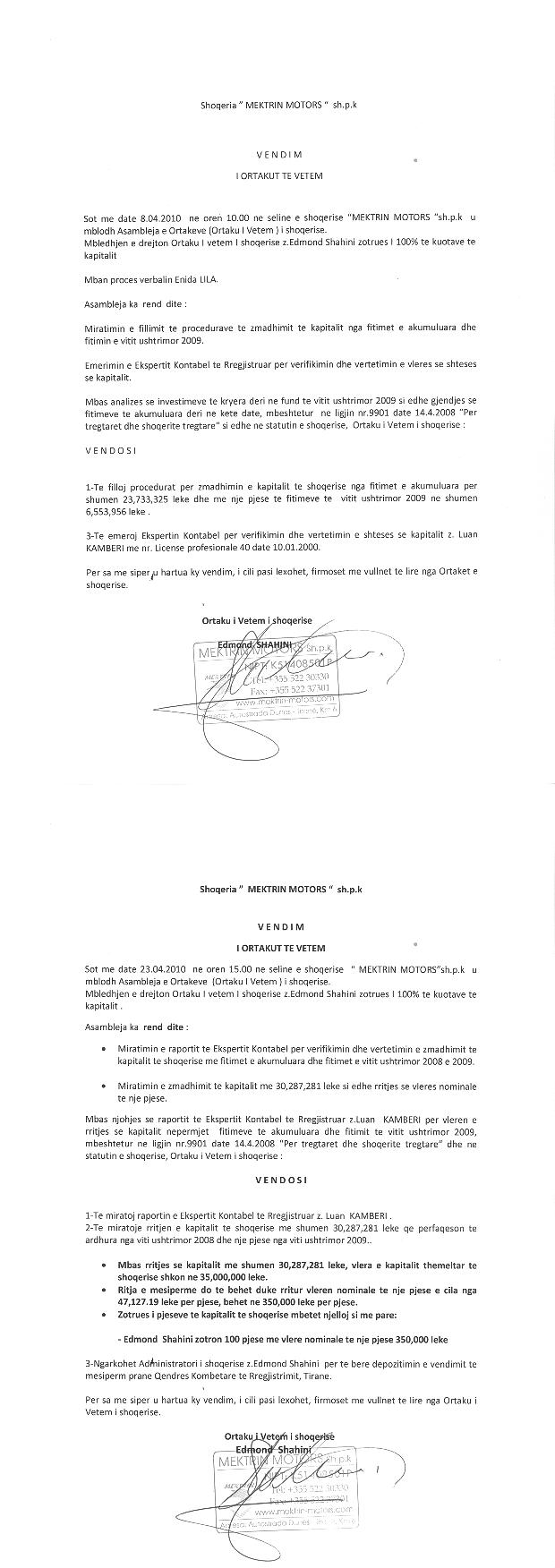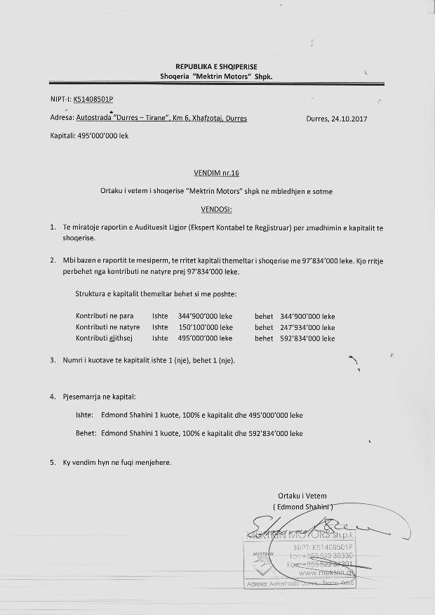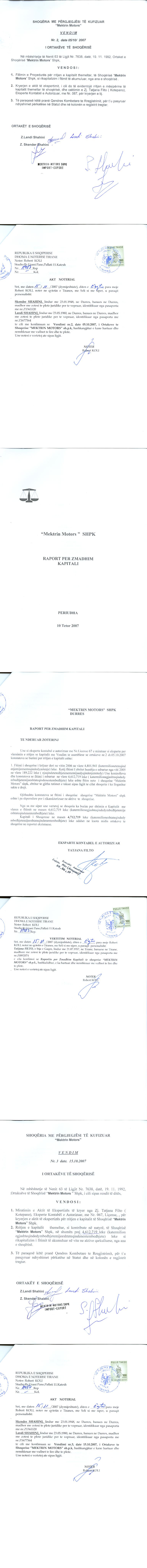 → Ekstrakt historik i regjistrit tregtar 29.11.2023 → Akti i themelimit → Kontrate shitblerje kuotash 30.04.2007 → Vendim i ortakeve per fillimin e procedures se rritjes se kapitalit, date 05.10.2007 → Kontrate shitje kuotash 17.12.2008 → Vendim i ortakut te vetem per rritjen e kapitalit date 08.04.2010 → Vendim i ortakut te vetem per zmadhimin e kapitalit date 24.10.2017 → Vendim i ortakut te vetem per zmadhimin e kapitalit date 28.05.2017 → Ekstrakt historik i regjistrit tregtar date 08.10.2025 |