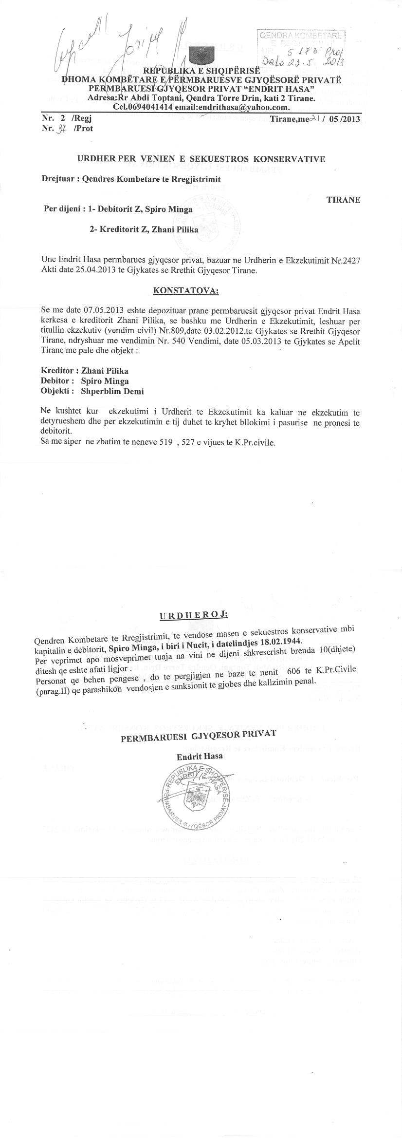 | Shënime: | 1. 23.05.2013 Numri i ceshtjes: CN-107203-05-13 Arsyet e hapjes se ceshtjes: Depozitimi i Urdhrit Nr. 2 Regj., Nr. 37 Prot., datë 21.05.2013, lëshuar nga Permbaruesi Gjyqesor Privat “ENDRIT HASA”, ku është urdhëruar:" Vendosja e masës së sekuestros konservative mbi kapitalin e debitorit Spiro Minga”. 2. 12.05.2015 Numri i ceshtjes: CN-043771-05-15 Arsyet e hapjes se ceshtjes: Depozitimi i urdhrit Nr. 1078 Prot. date 27.04.2015, leshuar nga permbaruesi gjyqesor privat "Endrit Hasa", per heqjen e mases se sekuestros te vendosur mbi debitorin Spiro Minga, urdheruar me shkresen Nr. 37/ Prot. date 21.05.2013 te Permbaruesit Gjyqesor Privat. |