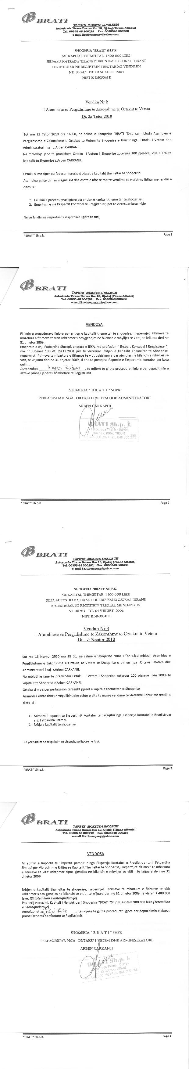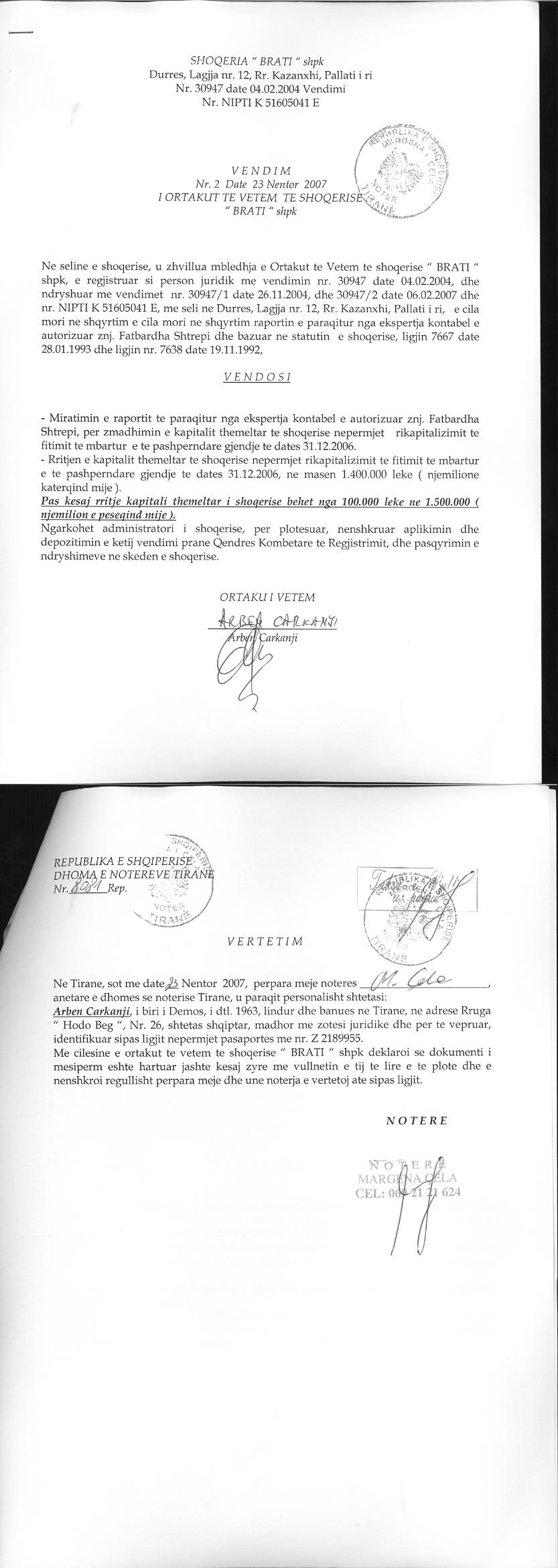 → Ekstrakti Historik i Regjistrit Tregtar date 13.03.2023 → Akt themelimi dhe Statuti i Shoqerise → Kontrate Shitje Kuotash date 26.01.2007 → Vendim i Ortakut te Vetem, Zmadhim Kapitali date 23.11.2007 → Vendim i Ortakut te Vetem, Zmadhim Kapitali date 15.11.2010 |
